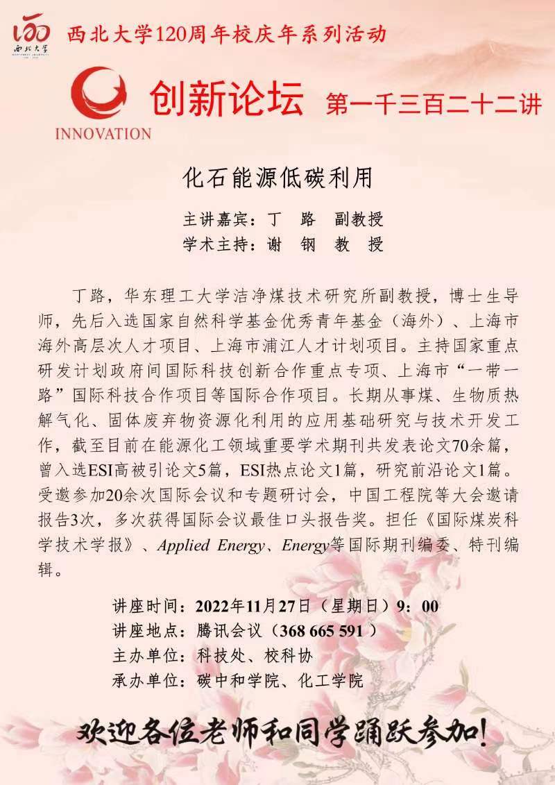 丁路 副教授 bat365正版唯一官网创新论坛第一千三百二十二讲暨120周年校庆年系列活动: 化石能源低碳利用 讲座时间 2022年11月27日(星期日) 9:00 讲座地点 腾讯会议368 665 591 讲座人介绍 丁路 副教授 讲座内容