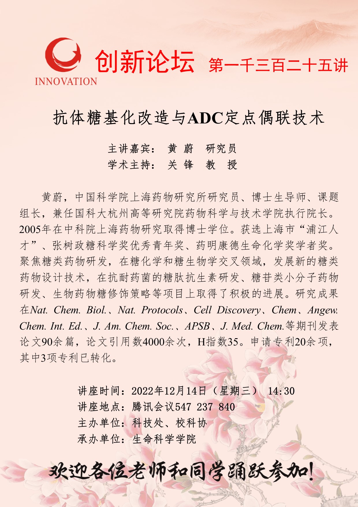黄蔚 研究员 bat365正版唯一官网创新论坛第一千三百二十五讲:抗体糖基化改造与ADC定点偶联技术 讲座时间 2022年12月14日(星期三) 14:30 讲座地点 腾讯会议547 237 840 讲座人介绍 黄蔚 研究员 讲座内容