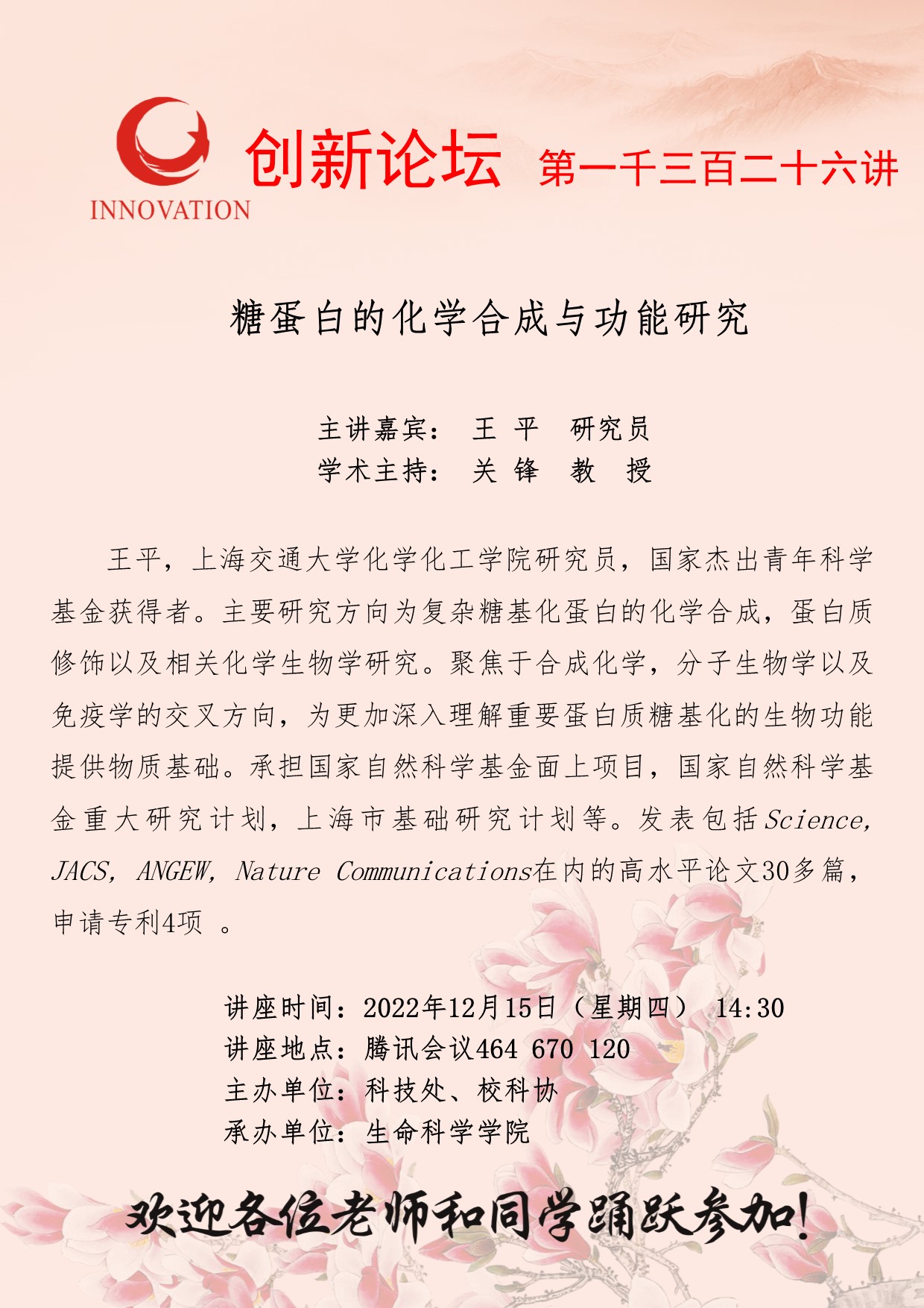 王平 研究员 bat365正版唯一官网创新论坛第一千三百二十六讲:糖蛋白的化学合成与功能究 讲座时间 2022年12月15日(星期四) 14:30 讲座地点 腾讯会议464 670 120 讲座人介绍 王平 研究员 讲座内容