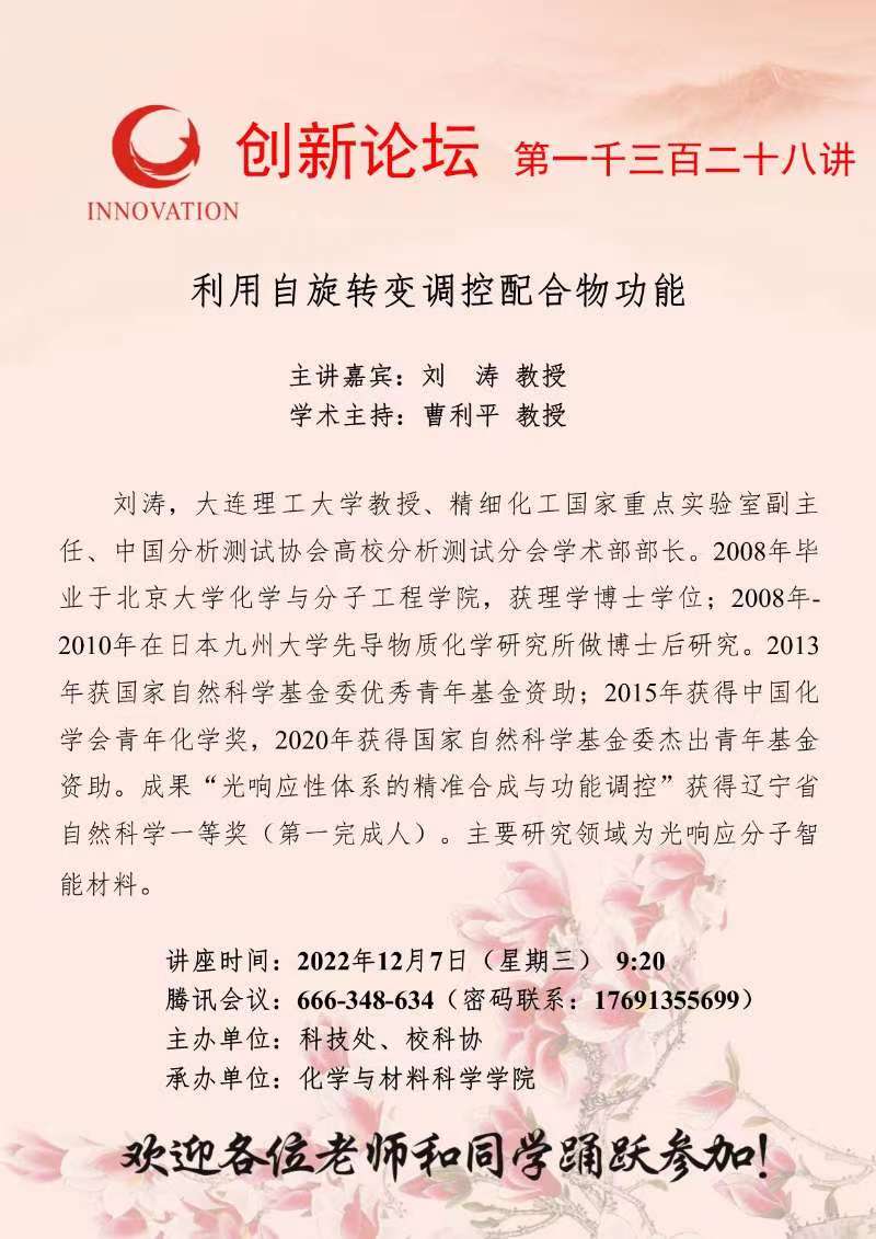 刘涛 教授 bat365正版唯一官网创新论坛第一千三百二十八讲:利用自旋转变调控配合物功能 讲座时间 2022年12月7日(星期三) 9:20 讲座地点 腾讯会议:666-348-634 讲座人介绍 刘涛 教授 讲座内容