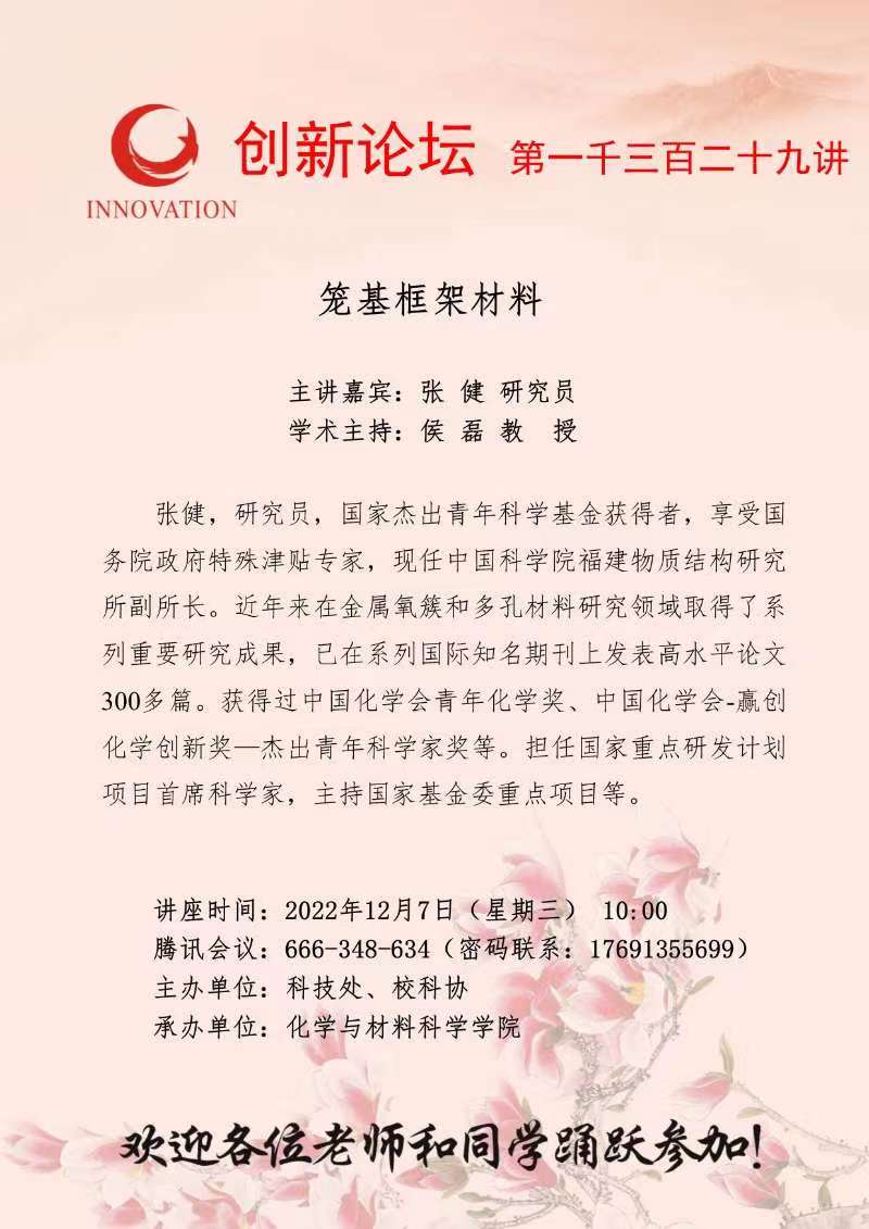 张健 研究员 bat365正版唯一官网创新论坛第一千三百二十九讲:笼基框架材料 讲座时间 2022年12月7日(星期三) 10:00 讲座地点 腾讯会议:666-348-634 讲座人介绍 张健 研究员 讲座内容