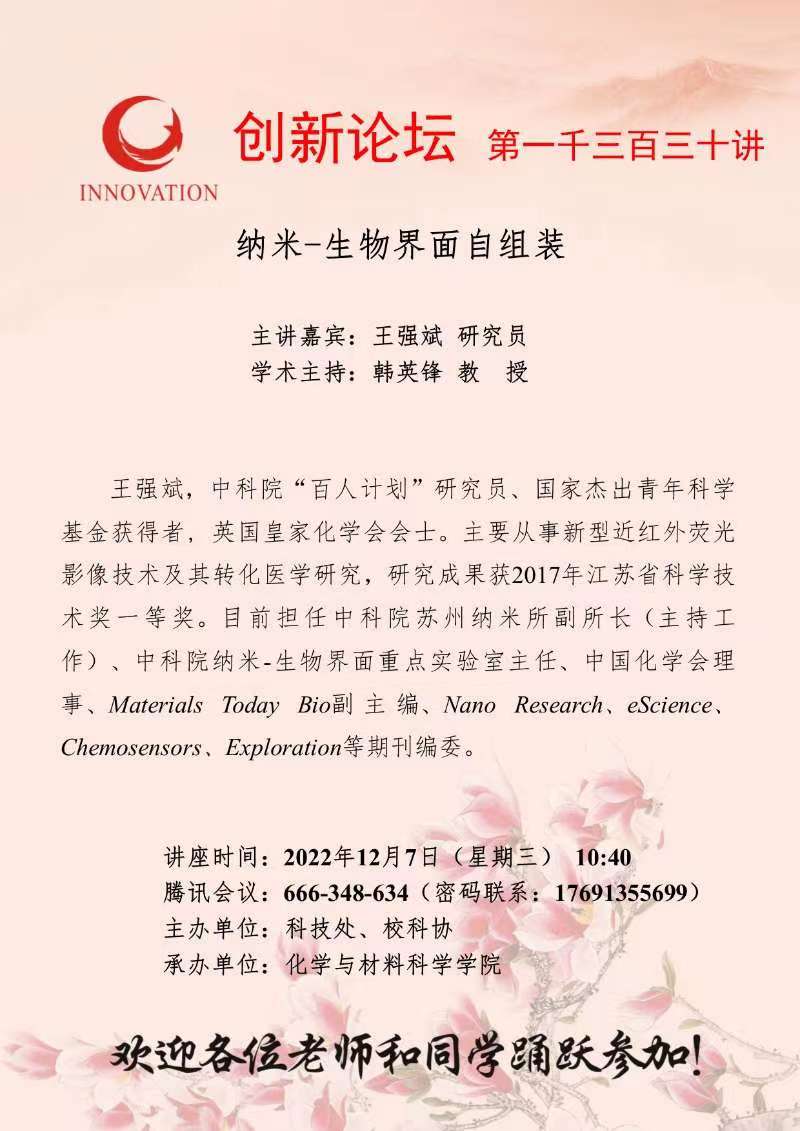 王强斌 研究员 bat365正版唯一官网创新论坛第一千三百三十讲:纳米-生物界面自组装 讲座时间 2022年12月7日(星期三) 10:40 讲座地点 腾讯会议:666-348-634 讲座人介绍 王强斌 研究员 讲座内容