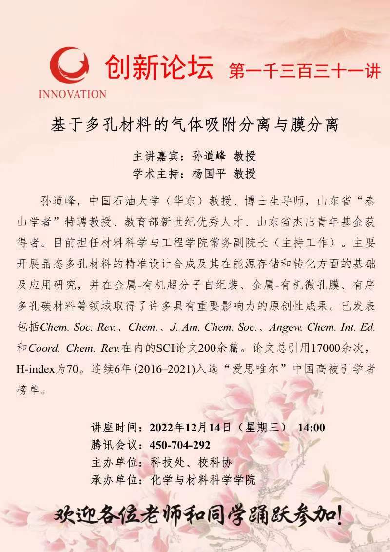 孙道峰 教授 bat365正版唯一官网创新论坛第一千三百三十一讲:基于多孔材料的气体吸附分离与膜分离 讲座时间 2022年12月14日(星期三) 14:00 讲座地点 腾讯会议:450-704-292 讲座人介绍 孙道峰 教授 讲座内容