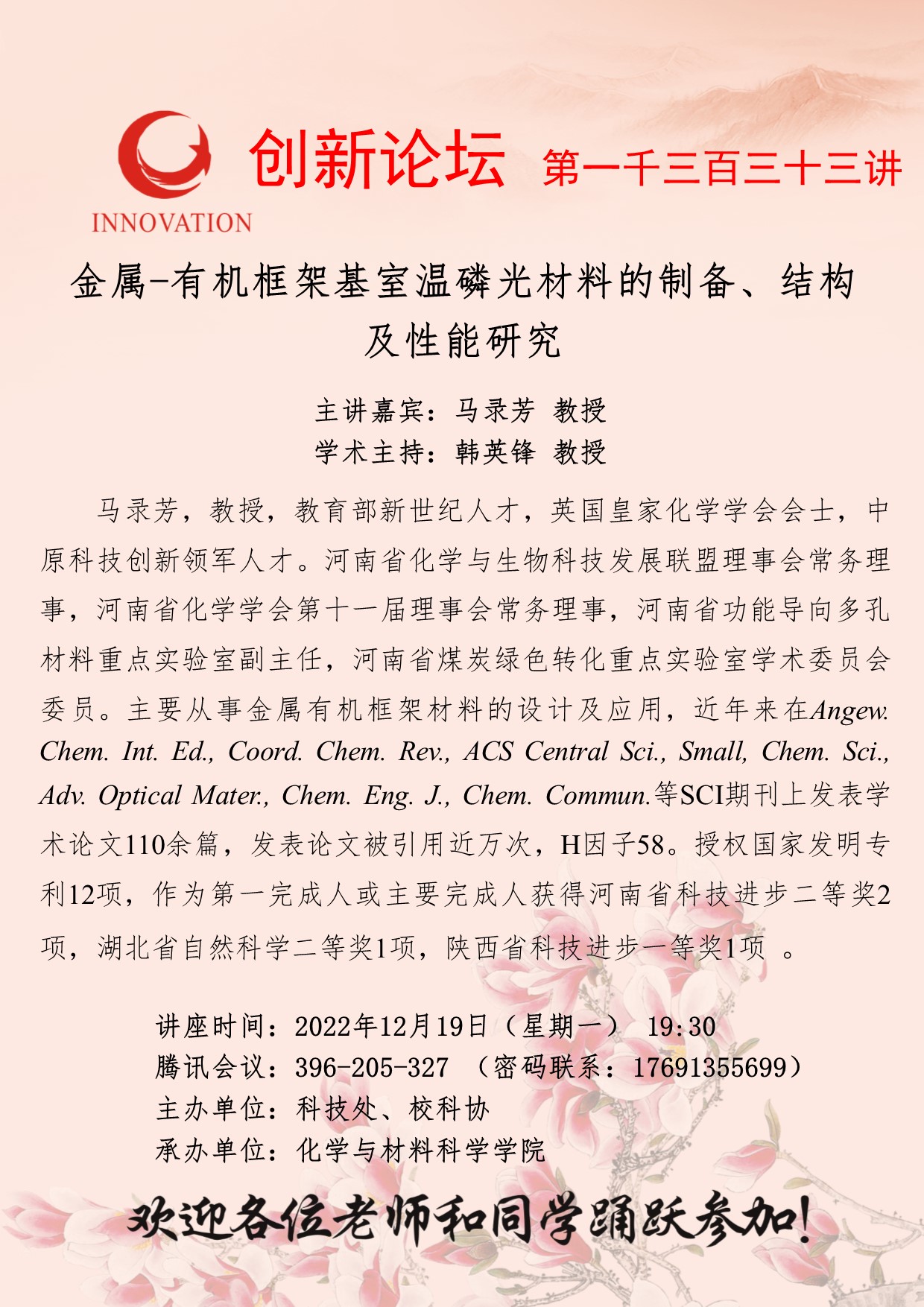 马录芳 教授 bat365正版唯一官网创新论坛第一千三百三十三讲:金属-有机框架基室温磷光材料的制备、结构及性能研究 讲座时间 2022年12月19日(星期一) 19:30 讲座地点 腾讯会议:396-205-327 讲座人介绍 马录芳 教授 讲座内容