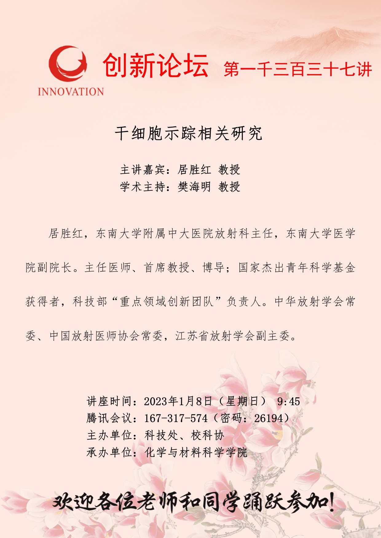 居胜红 教授 bat365正版唯一官网创新论坛第一千三百三十七讲:干细胞示踪相关研究 讲座时间 2023年1月8日(星期日) 9:45 讲座地点 腾讯会议:167-317-574 讲座人介绍 居胜红 教授 讲座内容