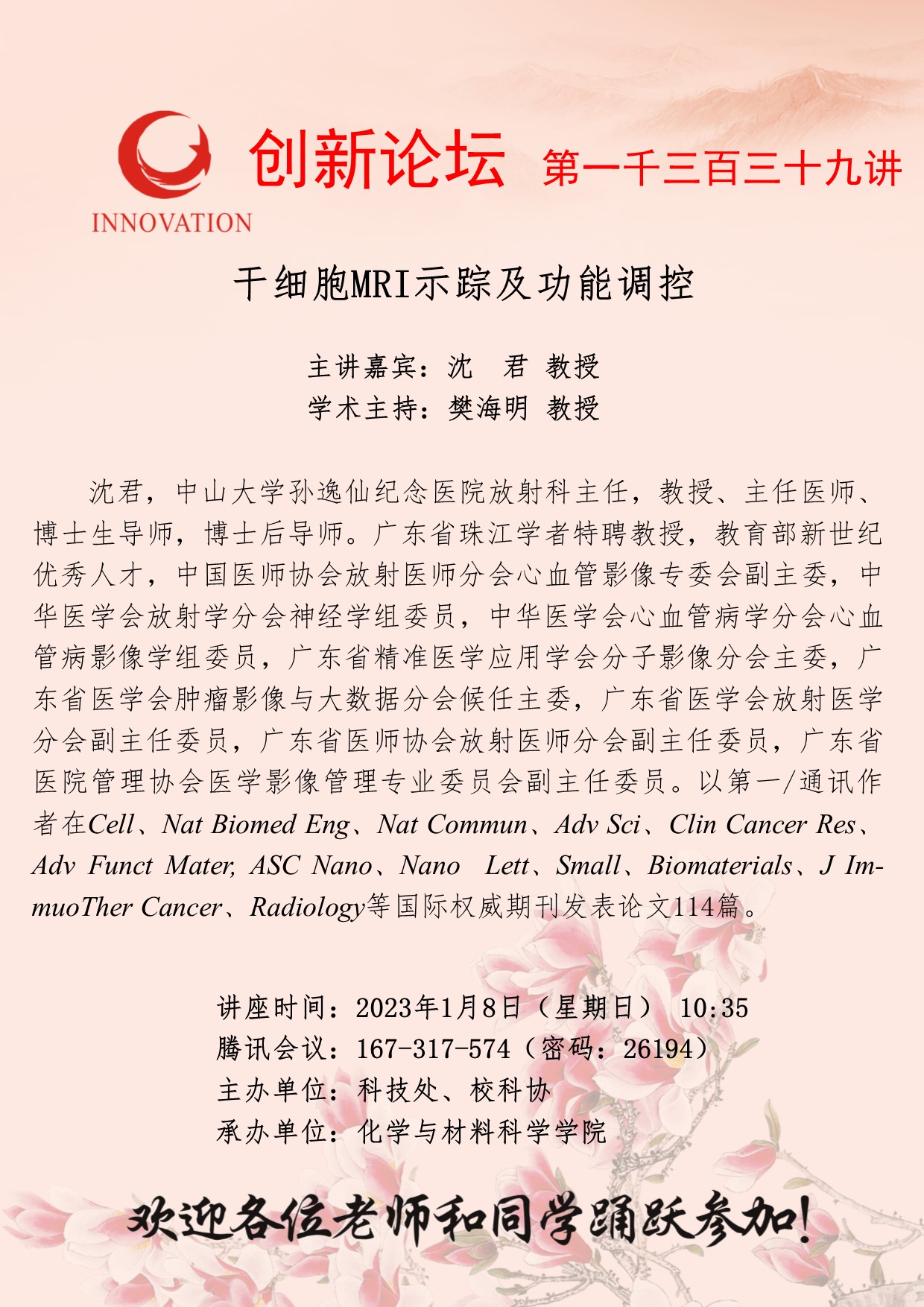 沈君 教授 bat365正版唯一官网创新论坛第一千三百三十九讲:干细胞MRI示踪及功能调控 讲座时间 2023年1月8日(星期日) 10:35 讲座地点 腾讯会议:167-317-574 讲座人介绍 沈君 教授 讲座内容