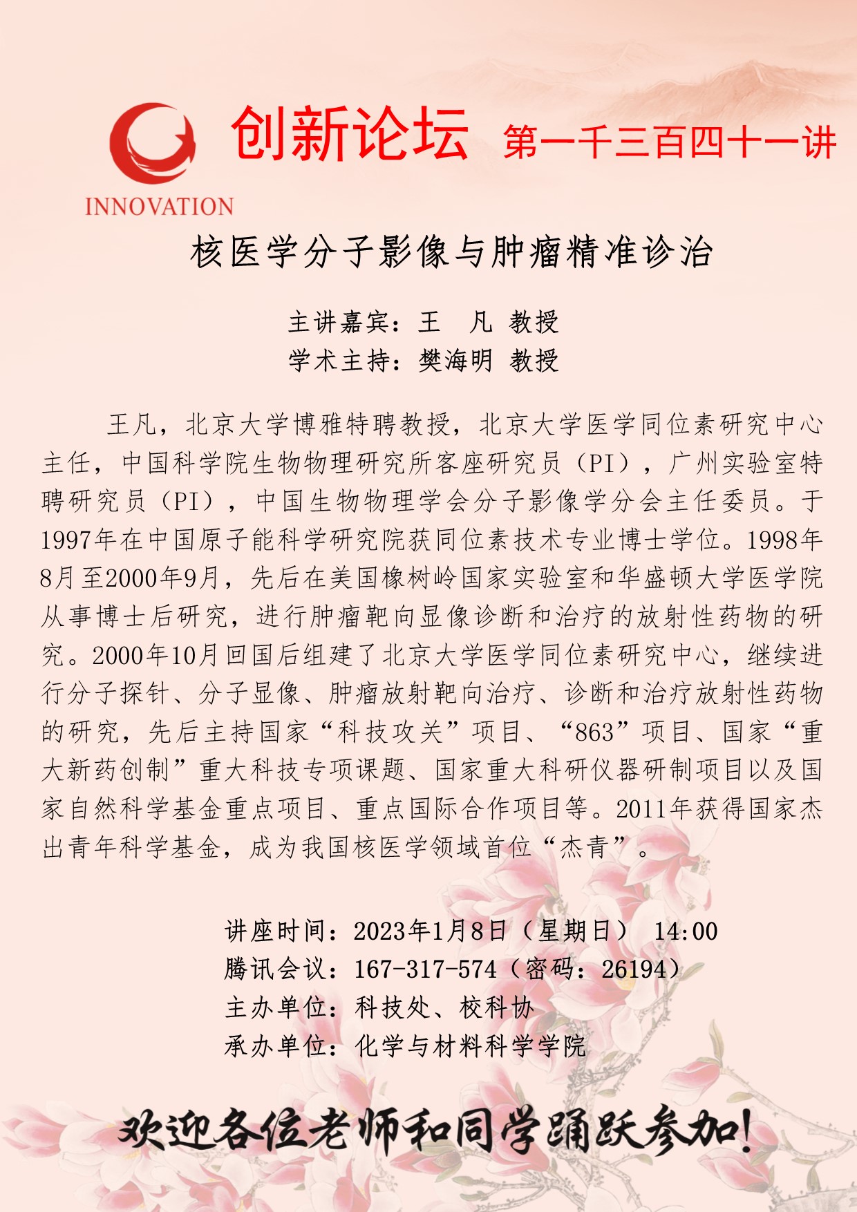 王凡 教授 bat365正版唯一官网创新论坛第一千三百四十一讲:核医学分子影像与肿瘤精准诊治 讲座时间 2023年1月8日(星期日) 14:00 讲座地点 腾讯会议:167-317-574 讲座人介绍 王凡 教授 讲座内容