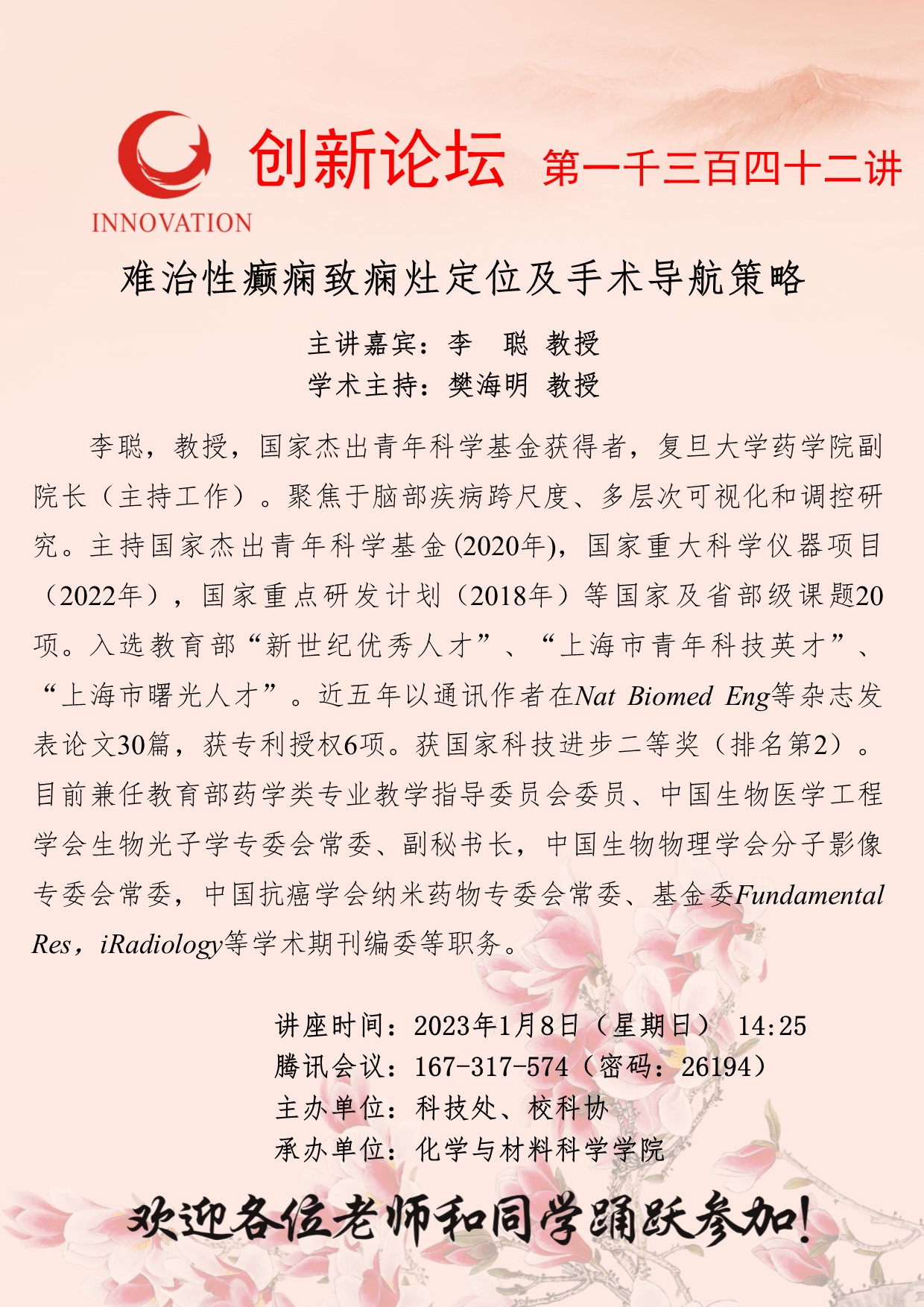 李聪 教授 bat365正版唯一官网创新论坛第一千三百四十二讲:难治性癫痫致痫灶定位及手术导航策略 讲座时间 2023年1月8日(星期日) 14:25 讲座地点 腾讯会议:167-317-574 讲座人介绍 李聪 教授 讲座内容