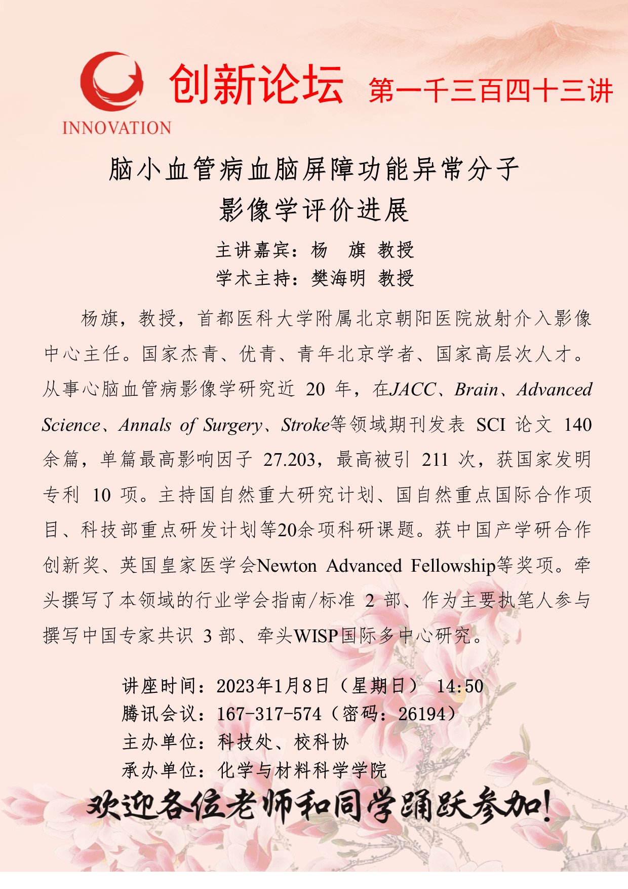 杨旗 教授 bat365正版唯一官网创新论坛第一千三百四十三讲:脑小血管病血脑屏障功能异常分子影像学评价进展 讲座时间 2023年1月8日(星期日) 14:50 讲座地点 腾讯会议:167-317-574 讲座人介绍 杨旗 教授 讲座内容