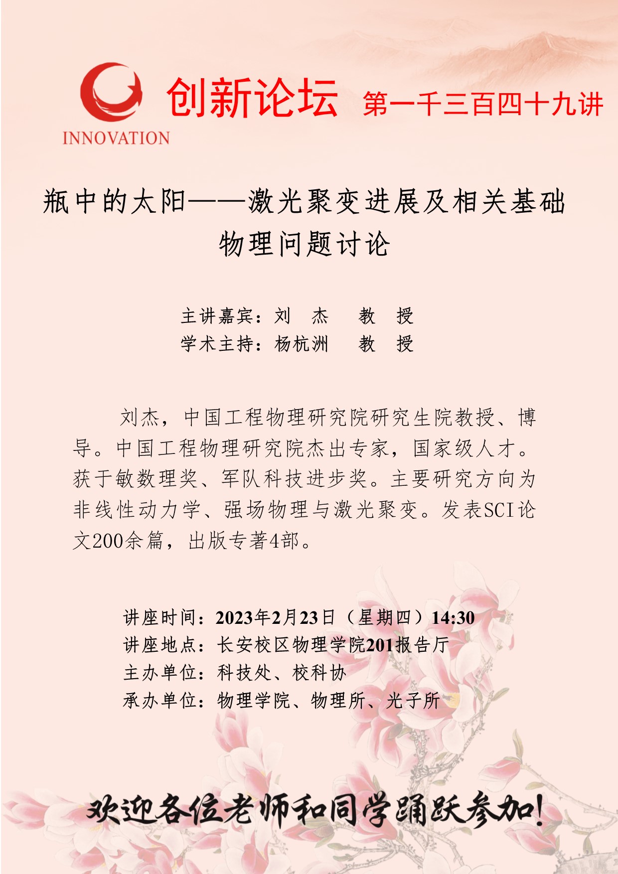 刘杰 教授 bat365正版唯一官网创新论坛第一千三百四十九讲:瓶中的太阳——激光聚变进展及相关基础物理问题讨论 讲座时间 2023年2月23日(星期四)14:30 讲座地点 长安校区物理学院201报告厅 讲座人介绍 刘杰 教授 讲座内容