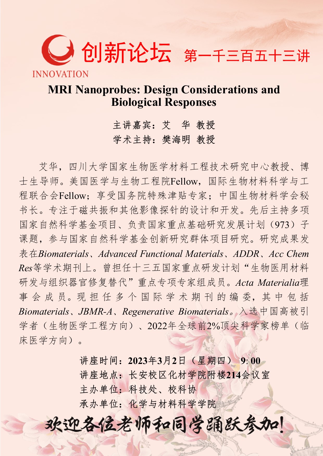 艾华 教授 bat365正版唯一官网创新论坛第一千三百五十三讲:MRI Nanoprobes: Design Considerations and Biological Responses 讲座时间 2023年3月2日(星期四) 9: 00 讲座地点 长安校区化材学院附楼214会议室 讲座人介绍 艾华 教授 讲座内容