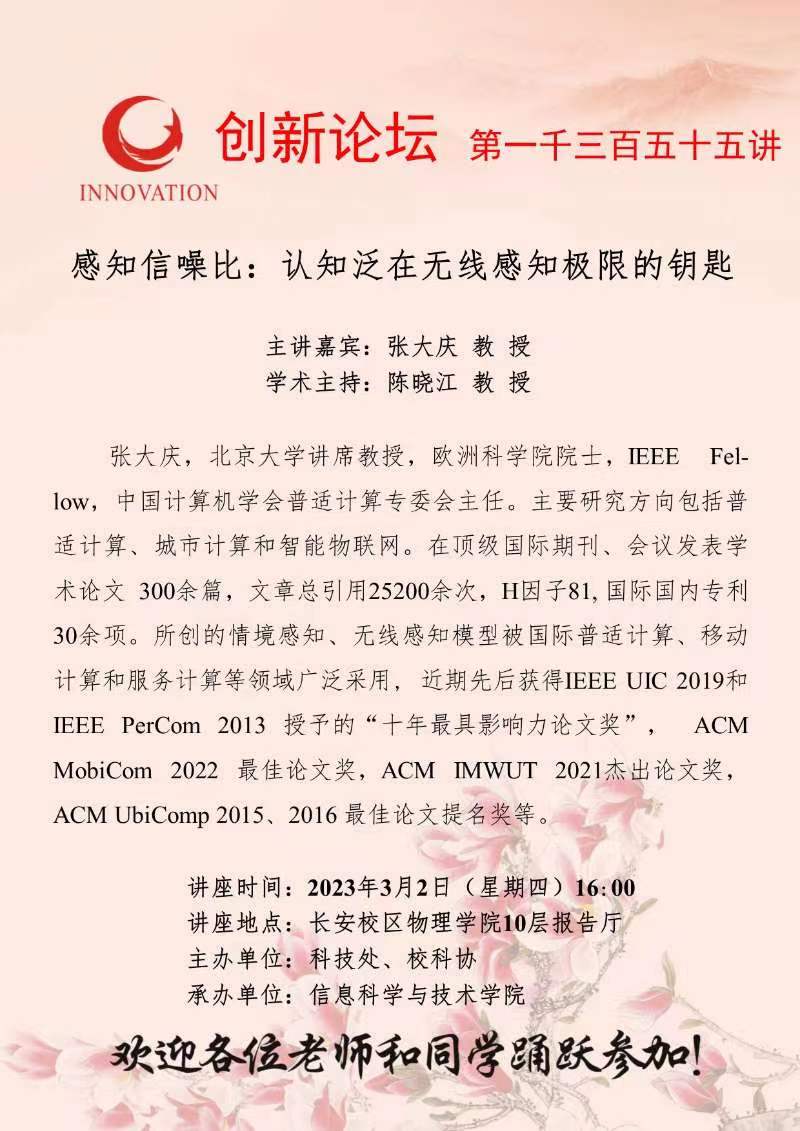 张大庆 教授 bat365正版唯一官网创新论坛第一千三百五十五讲:感知信噪比:认知泛在无线感知极限的钥匙 讲座时间 2023年3月2日(星期四)16:00 讲座地点 长安校区物理学院10层报告厅 讲座人介绍 张大庆 教授 讲座内容