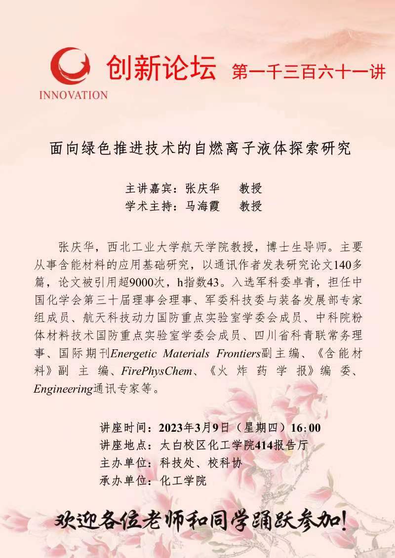张庆华 教授 bat365正版唯一官网创新论坛第一千三百六十一讲:面向绿色推进技术的自燃离子液体探索研究 讲座时间 2023年3月9日(星期四)16:00 讲座地点 太白校区化工学院414报告厅 讲座人介绍 张庆华 教授 讲座内容