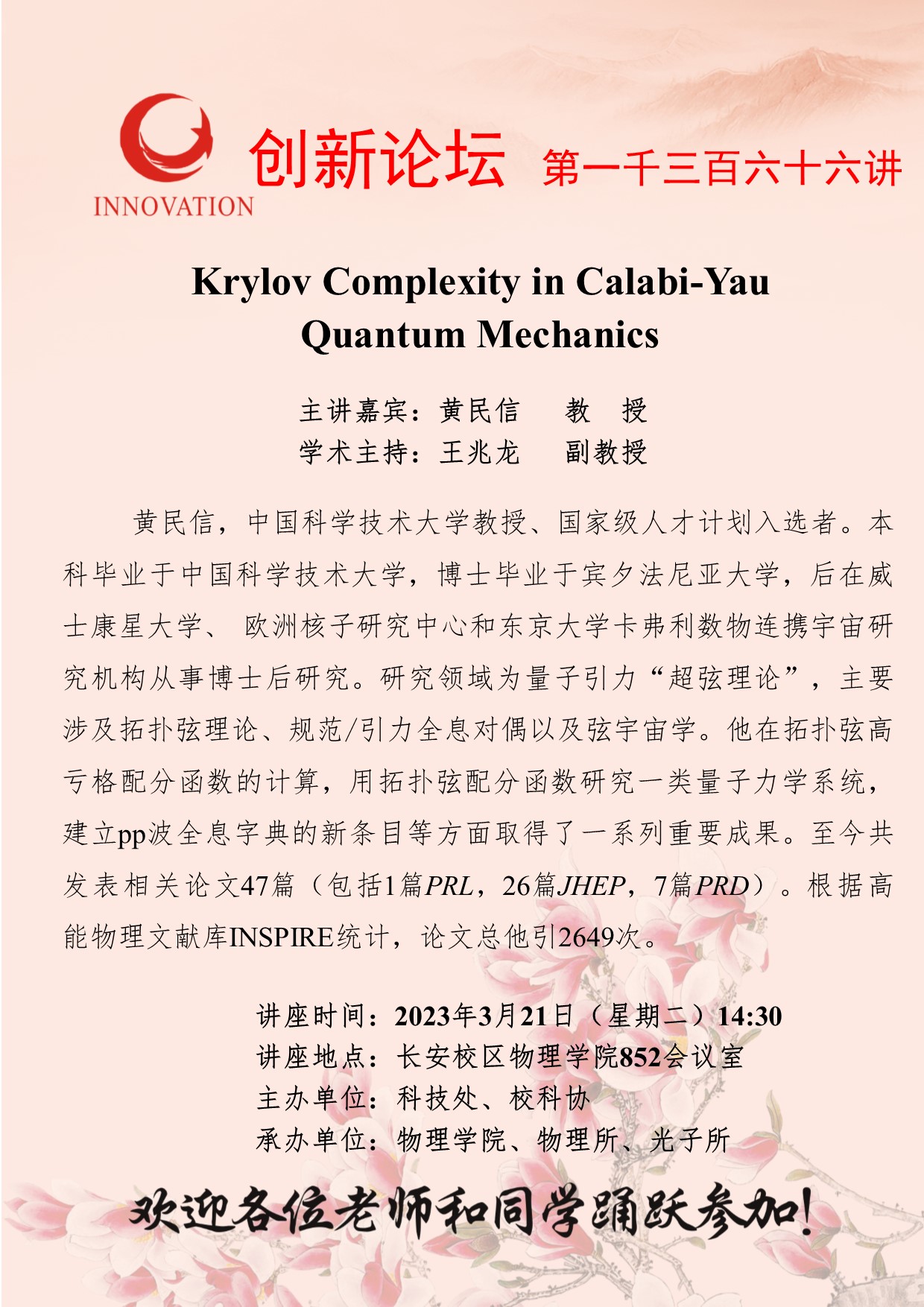 黄民信 教授 bat365正版唯一官网创新论坛第一千三百六十六讲:Krylov Complexity in Calabi-Yau Quantum Mechanics 讲座时间 2023年3月21日(星期二)14:30 讲座地点 长安校区物理学院852会议室 讲座人介绍 黄民信 教授 讲座内容