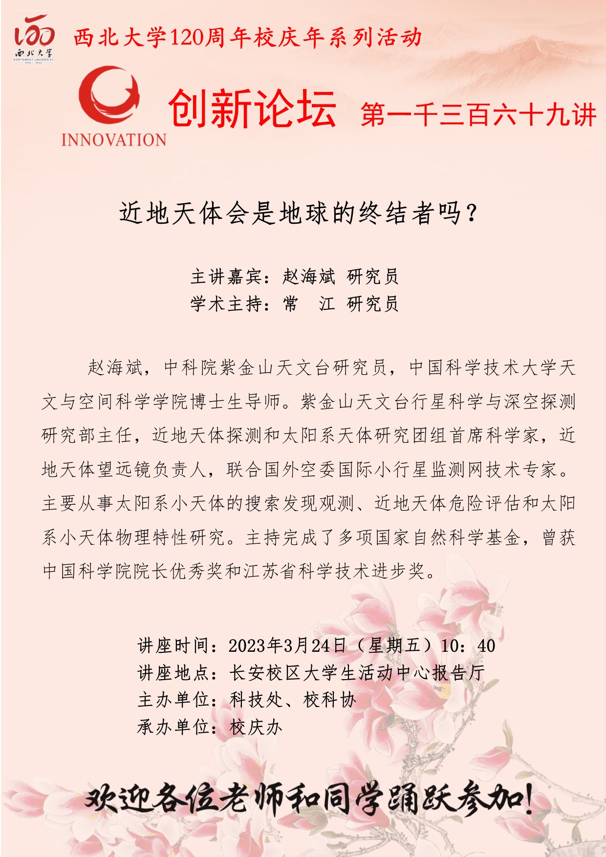 赵海斌 研究员 bat365正版唯一官网创新论坛第一千三百六十九讲暨120周年校庆年系列活动:近地天体会是地球的终结者吗? 讲座时间 2023年3月24日(星期五)10:40 讲座地点 长安校区大学生活动中心报告厅 讲座人介绍 赵海斌 研究员 讲座内容