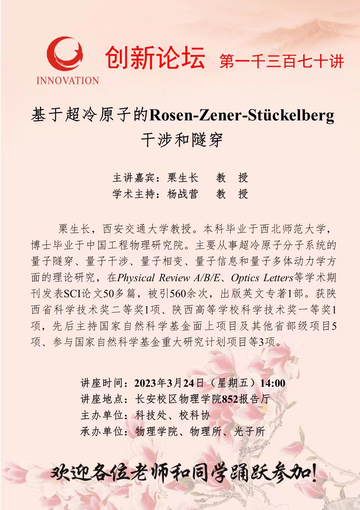 栗生长 教 授 bat365正版唯一官网创新论坛第一千三百七十讲:基于超冷原子的Rosen-Zener-Stückelberg干涉和隧穿 讲座时间 2023年3月24日(星期五)14:00 讲座地点 长安校区物理学院852报告厅 讲座人介绍 栗生长 教 授 讲座内容