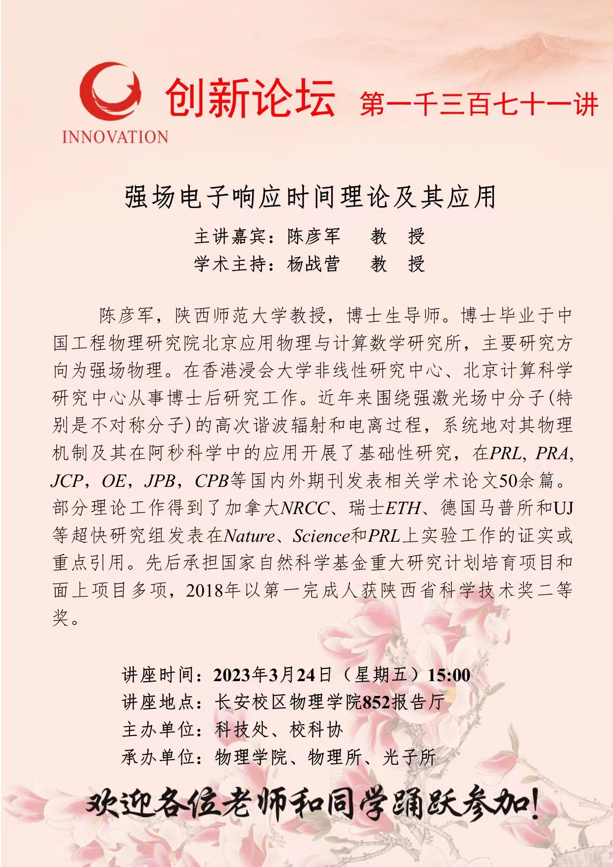 陈彦军 教 授 bat365正版唯一官网创新论坛第一千三百七十一讲:强场电子响应时间理论及其应用 讲座时间 2023年3月24日(星期五)15:00 讲座地点 长安校区物理学院852报告厅 讲座人介绍 陈彦军 教 授 讲座内容