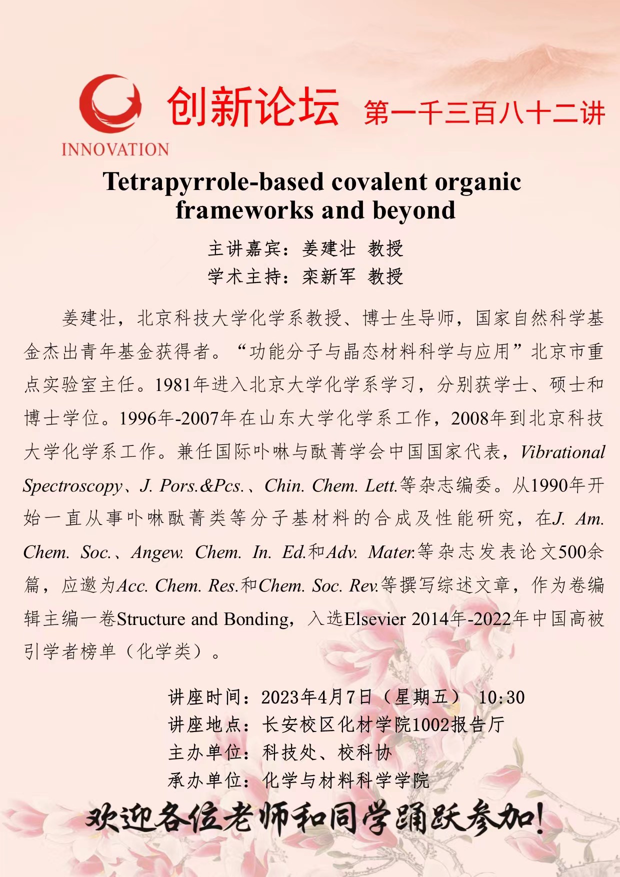 姜建壮 教 授 bat365正版唯一官网创新论坛第一千三百八十二讲:Tetrapyrrole-based covalent organic frameworks and beyond 讲座时间 2023年4月7日(星期五) 10:30 讲座地点 长安校区化材学院1002报告厅 讲座人介绍 姜建壮 教 授 讲座内容