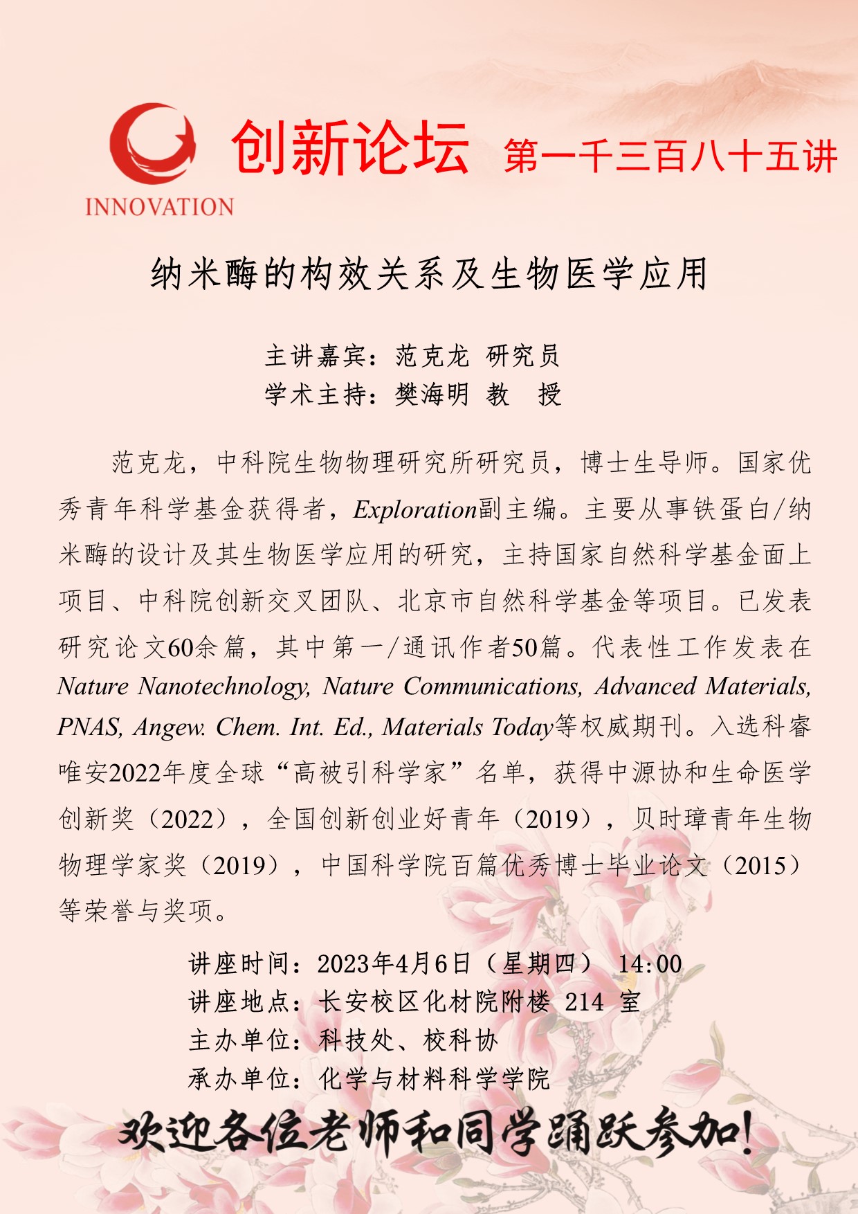 范克龙 研究员 bat365正版唯一官网创新论坛第一千三百八十五讲:纳米酶的构效关系及生物医学应用 讲座时间 2023年4月6日(星期四) 14:00 讲座地点 长安校区化材院附楼 214 室 讲座人介绍 范克龙 研究员 讲座内容