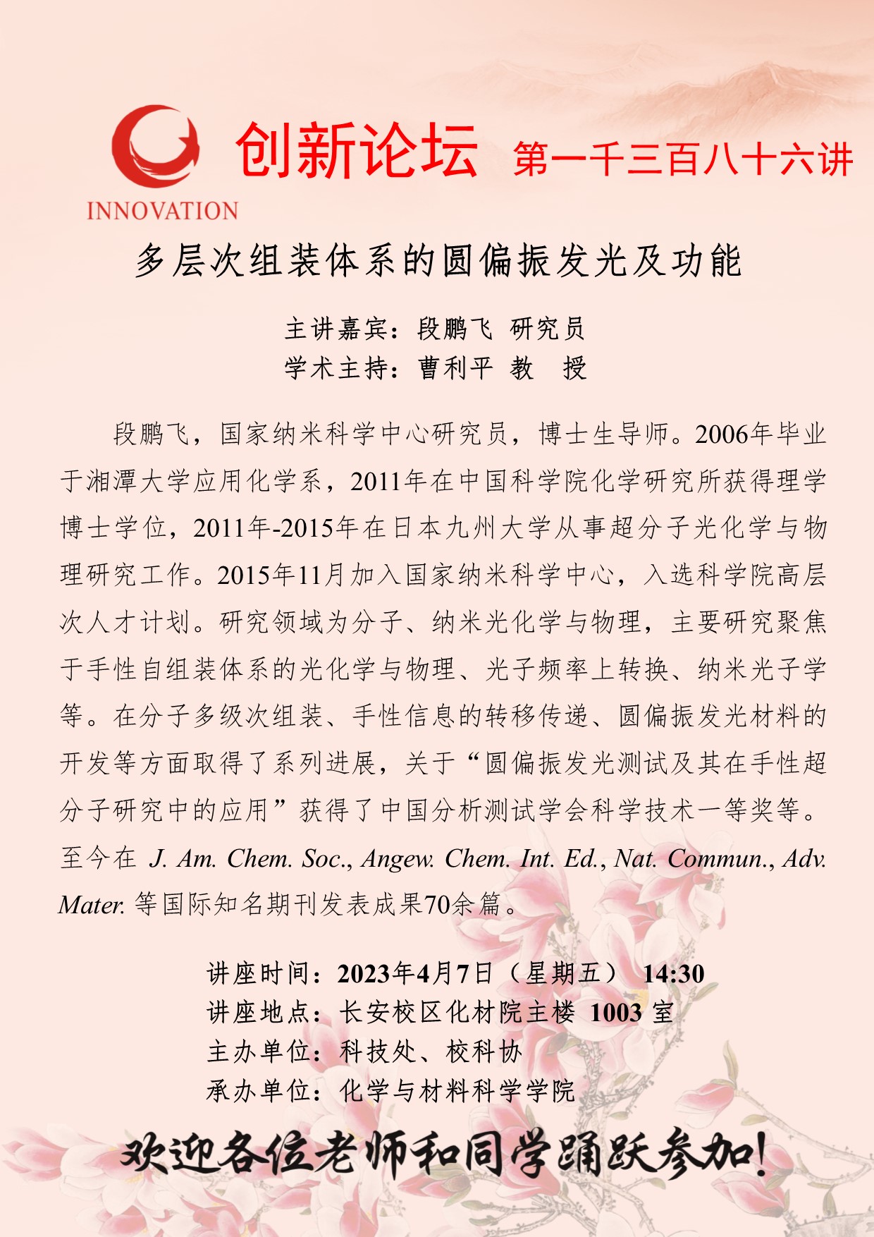 段鹏飞 研究员 bat365正版唯一官网创新论坛第一千三百八十六讲:多层次组装体系的圆偏振发光及功能应用 讲座时间 2023年4月7日(星期五) 14:30 讲座地点 长安校区化材院主楼 1003 室 讲座人介绍 段鹏飞 研究员 讲座内容