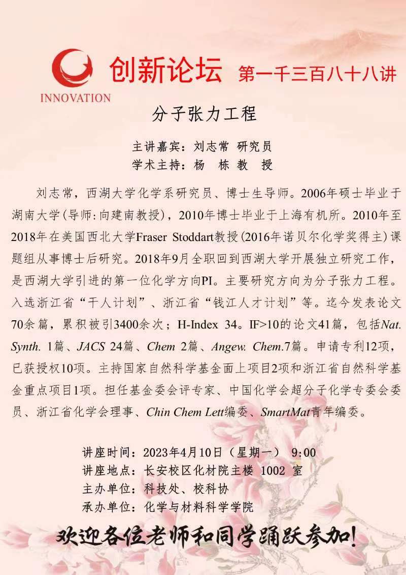 刘志常 研究员 bat365正版唯一官网创新论坛第一千三百八十八讲:分子张力工程 讲座时间 2023年4月10日(星期一) 9:00 讲座地点 长安校区化材院主楼1002 讲座人介绍 刘志常 研究员 讲座内容