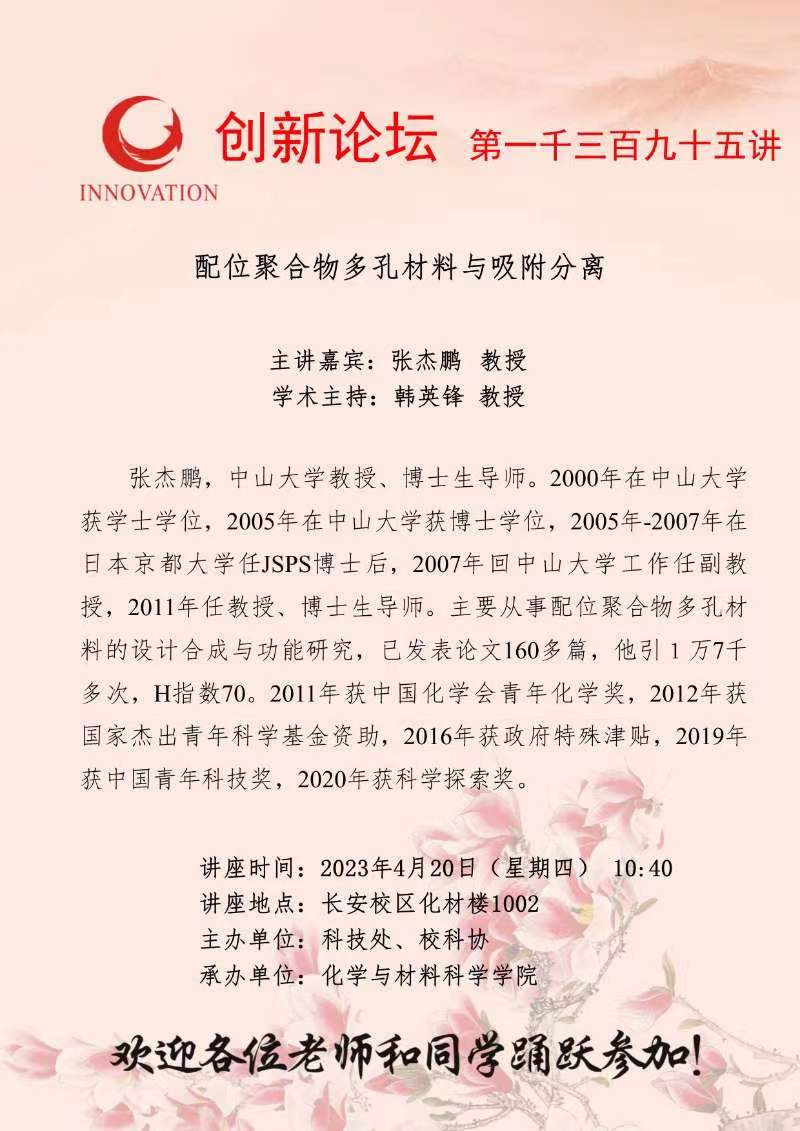 张杰鹏 教授 bat365正版唯一官网创新论坛第一千三百九十五讲:配位聚合物多孔材料与吸附分离 讲座时间 2023年4月20日(星期四) 10:40 讲座地点 长安校区化材楼1002 讲座人介绍 张杰鹏 教授 讲座内容