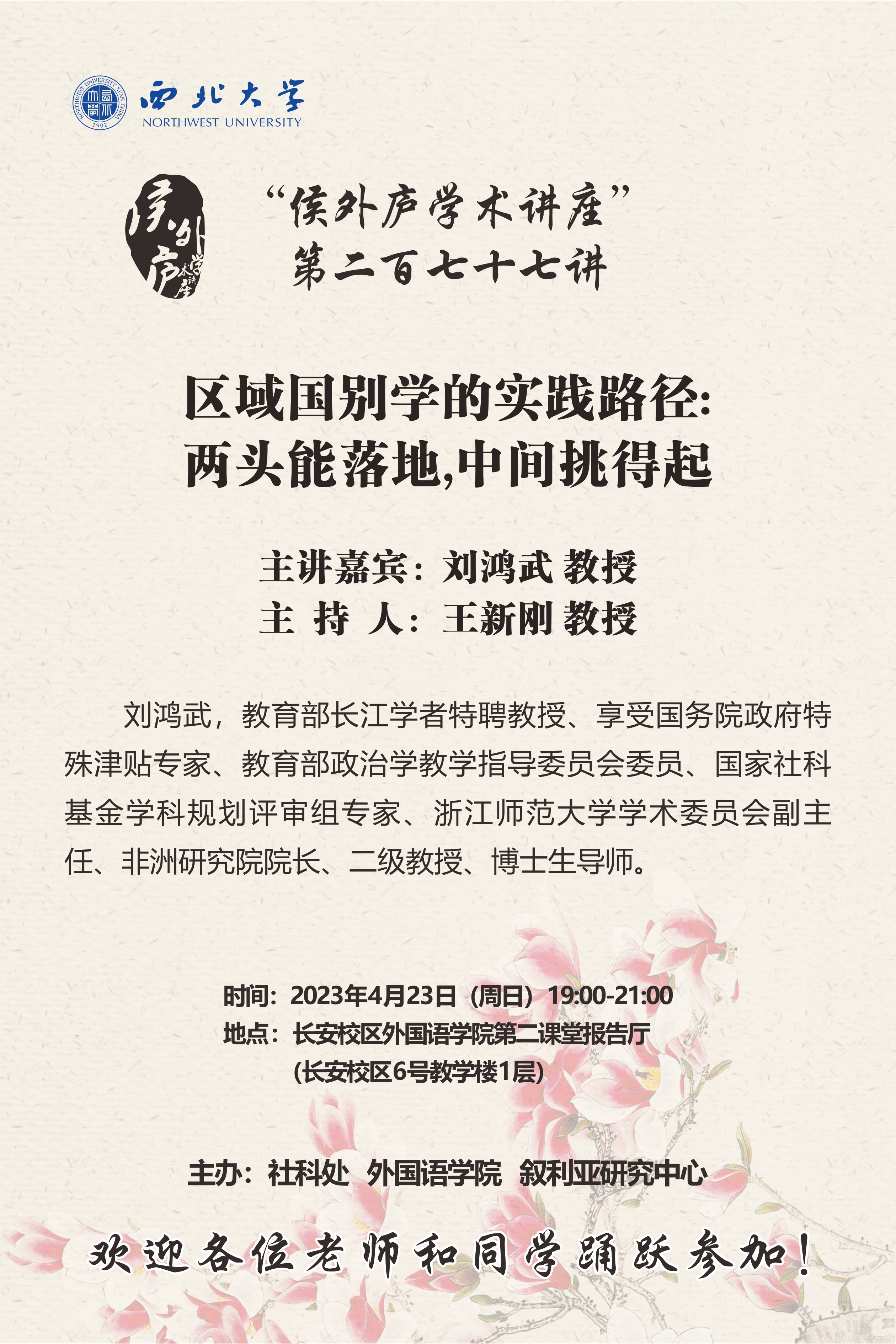 刘鸿武 教授 侯外庐学术讲座第二百七十七讲:区域国别学的实践路径:两头能落地,中间挑得起 讲座时间 2023年4月23日(周日)19:00 讲座地点 bat365正版唯一官网外国语学院第二课堂报告厅 讲座人介绍 刘鸿武 教授 讲座内容