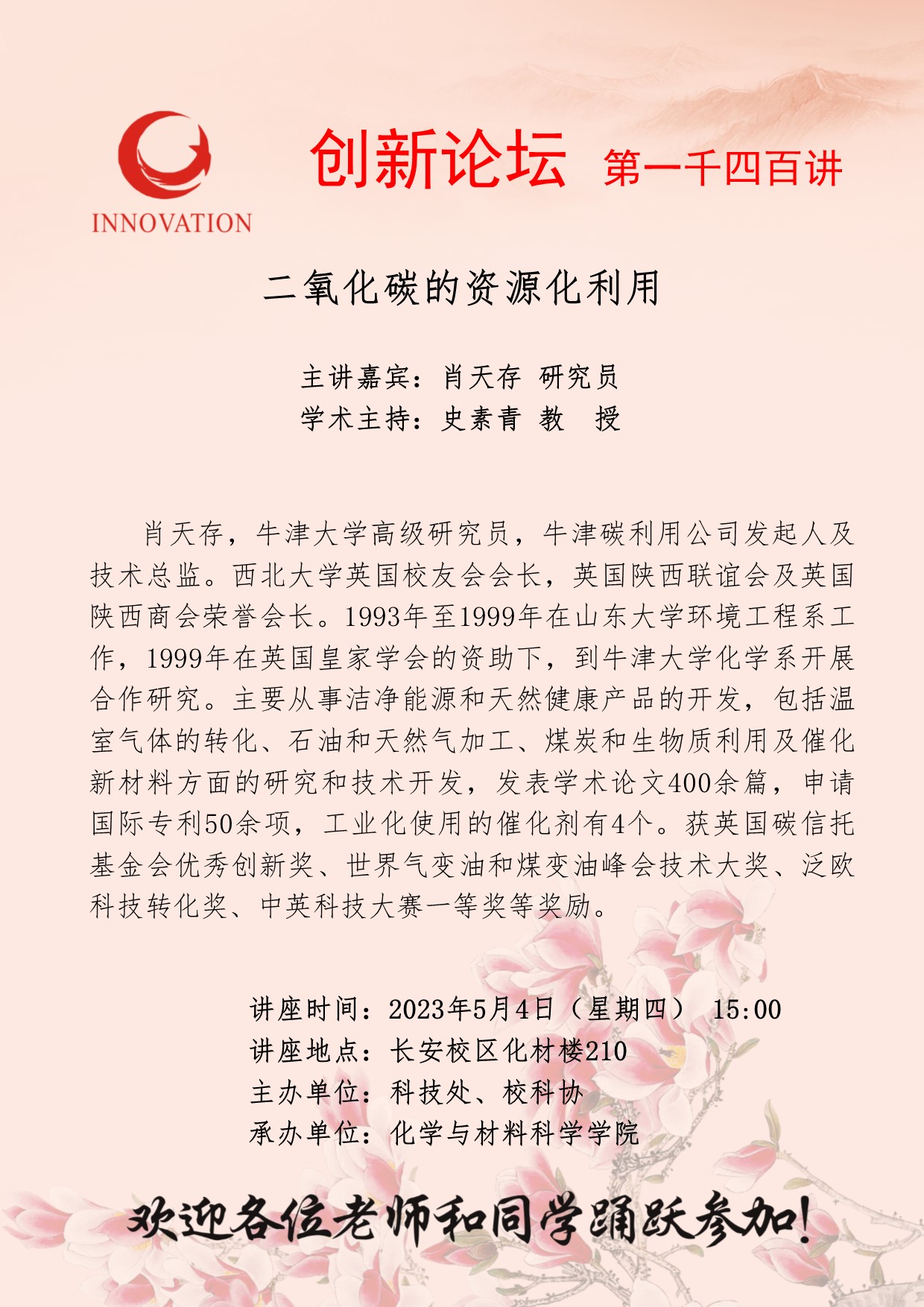 肖天存 研究员 bat365正版唯一官网创新论坛第一千四百讲:二氧化碳的资源化利用 讲座时间 2023年5月4日(星期四) 15:00 讲座地点 长安校区化材楼210 讲座人介绍 肖天存 研究员 讲座内容