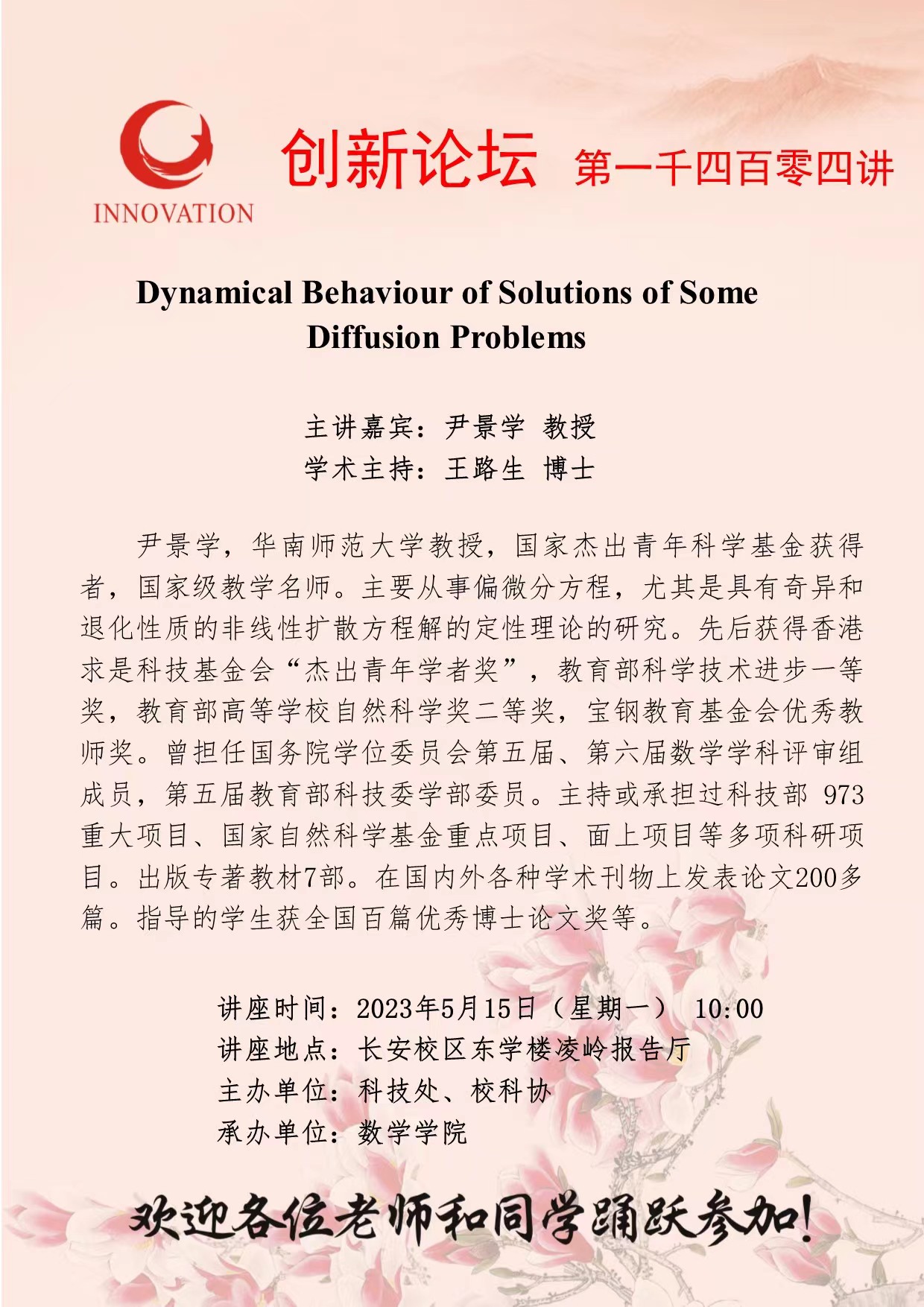 尹景学 教授 bat365正版唯一官网创新论坛第一千四百零四讲:Dynamical Behaviour of Solutions of Some Diffusion Problems 讲座时间 2023年5月15日(星期一) 10:00 讲座地点 长安校区东学楼凌岭报告厅 讲座人介绍 尹景学 教授 讲座内容