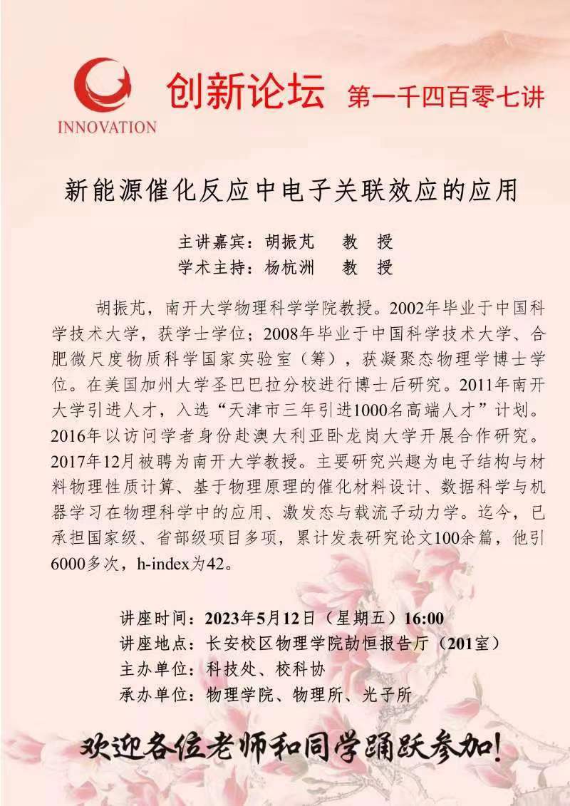 胡振芃 教 授 bat365正版唯一官网创新论坛第一千四百零七讲:新能源催化反应中电子关联效应的应用 讲座时间 2023年5月12日(星期五)16:00 讲座地点 长安校区物理学院劼恒报告厅(201室) 讲座人介绍 胡振芃 教 授 讲座内容