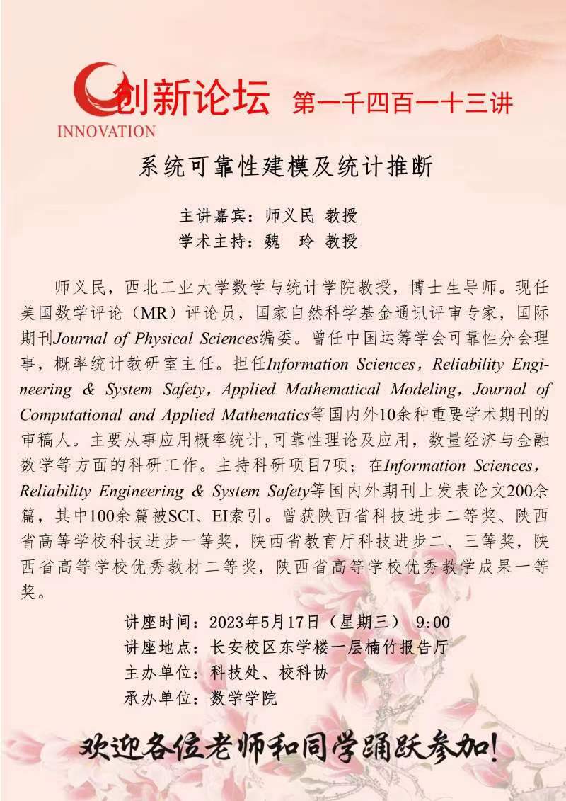 师义民 教授 bat365正版唯一官网创新论坛第一千四百一十三讲:系统可靠性建模及统计推断 讲座时间 2023年5月17日(星期三) 9:00 讲座地点 长安校区东学楼一层楠竹报告厅 讲座人介绍 师义民 教授 讲座内容