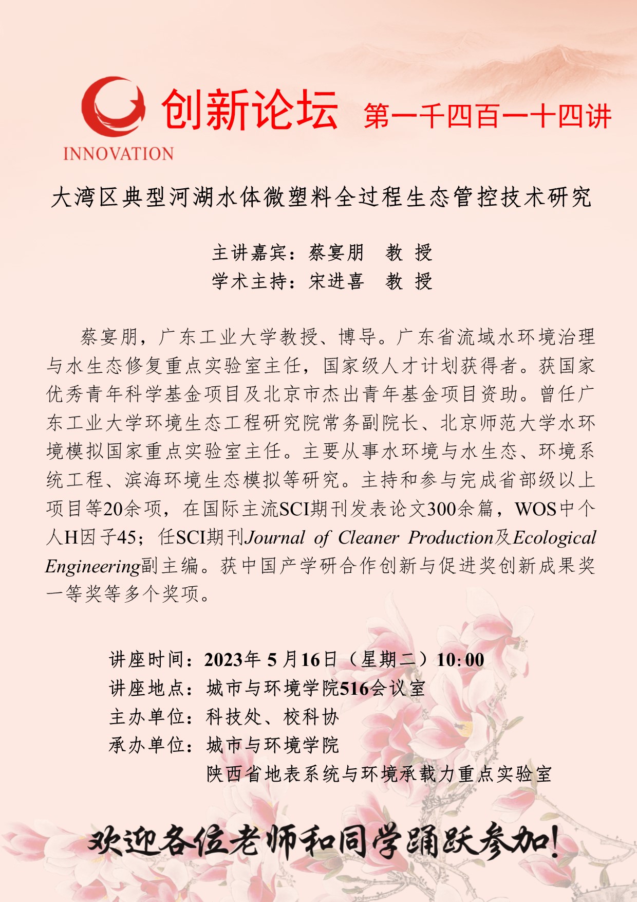 蔡宴朋 教 授 bat365正版唯一官网创新论坛第一千四百一十四讲:大湾区典型河湖水体微塑料全过程生态管控技术研究 讲座时间 2023年 5 月16日(星期二)10:00 讲座地点 城市与环境学院516会议室 讲座人介绍 蔡宴朋 教 授 讲座内容