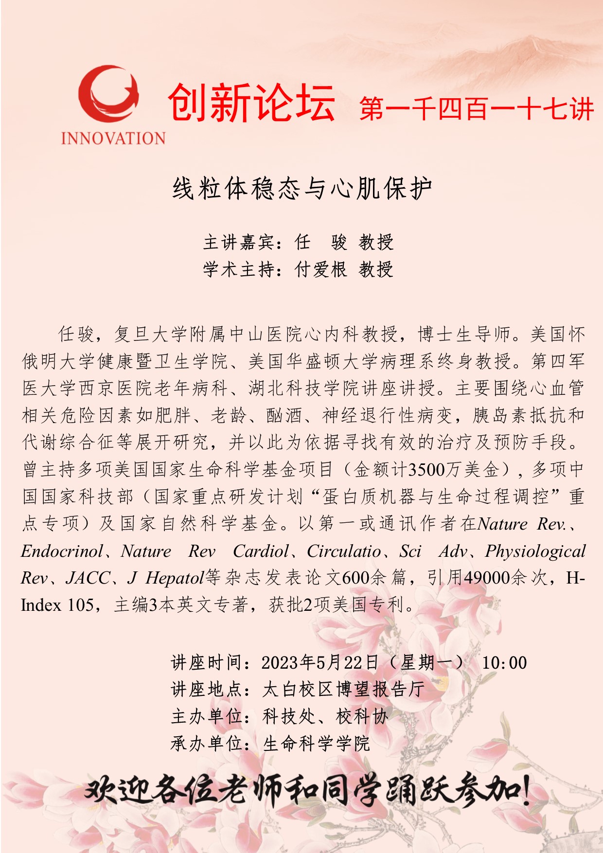 任骏 教授 bat365正版唯一官网创新论坛第一千四百一十七讲:线粒体稳态与心肌保护 讲座时间 2023年5月22日(星期一) 10:00 讲座地点 太白校区博望报告厅 讲座人介绍 任骏 教授 讲座内容