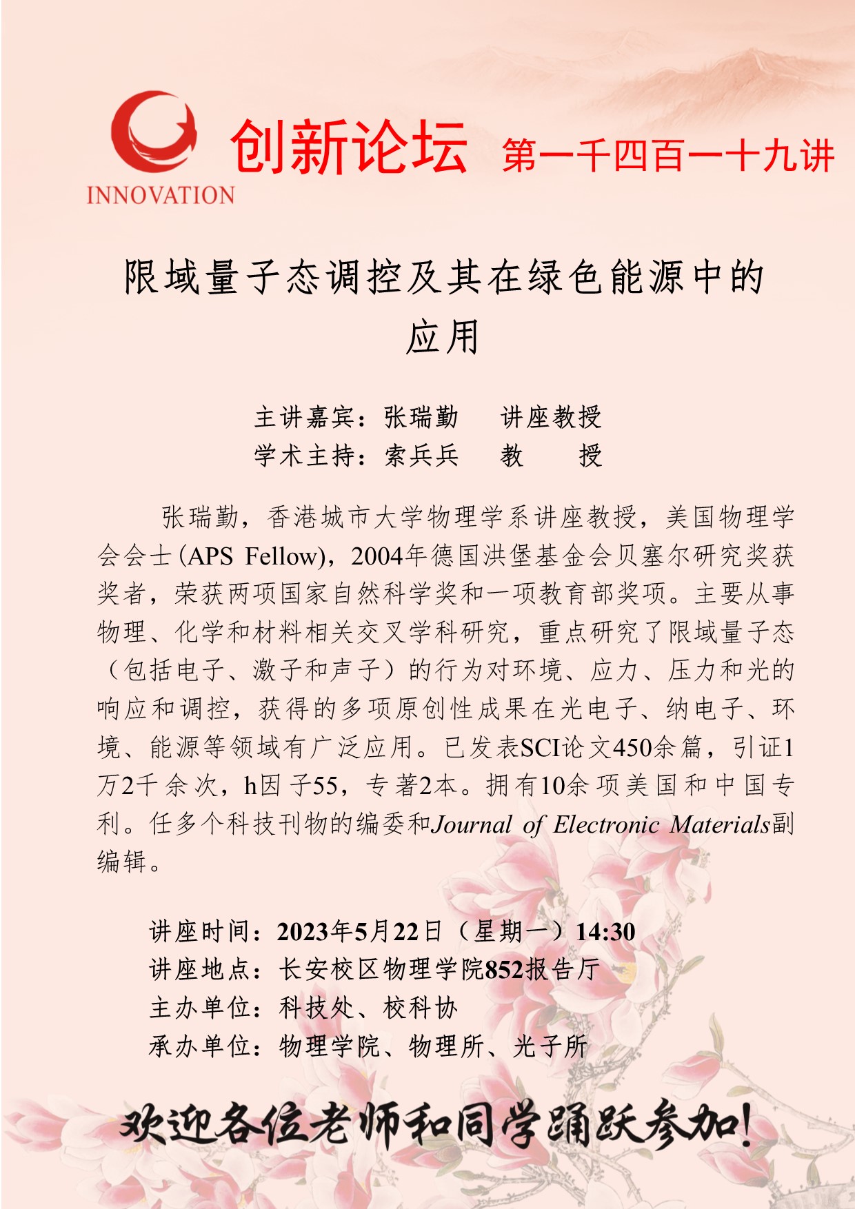张瑞勤 讲座教授 bat365正版唯一官网创新论坛第一千四百一十九讲:限域量子态调控及其在绿色能源中的应用 讲座时间 2023年5月22日(星期一)14:30 讲座地点 长安校区物理学院852报告厅 讲座人介绍 张瑞勤 讲座教授 讲座内容