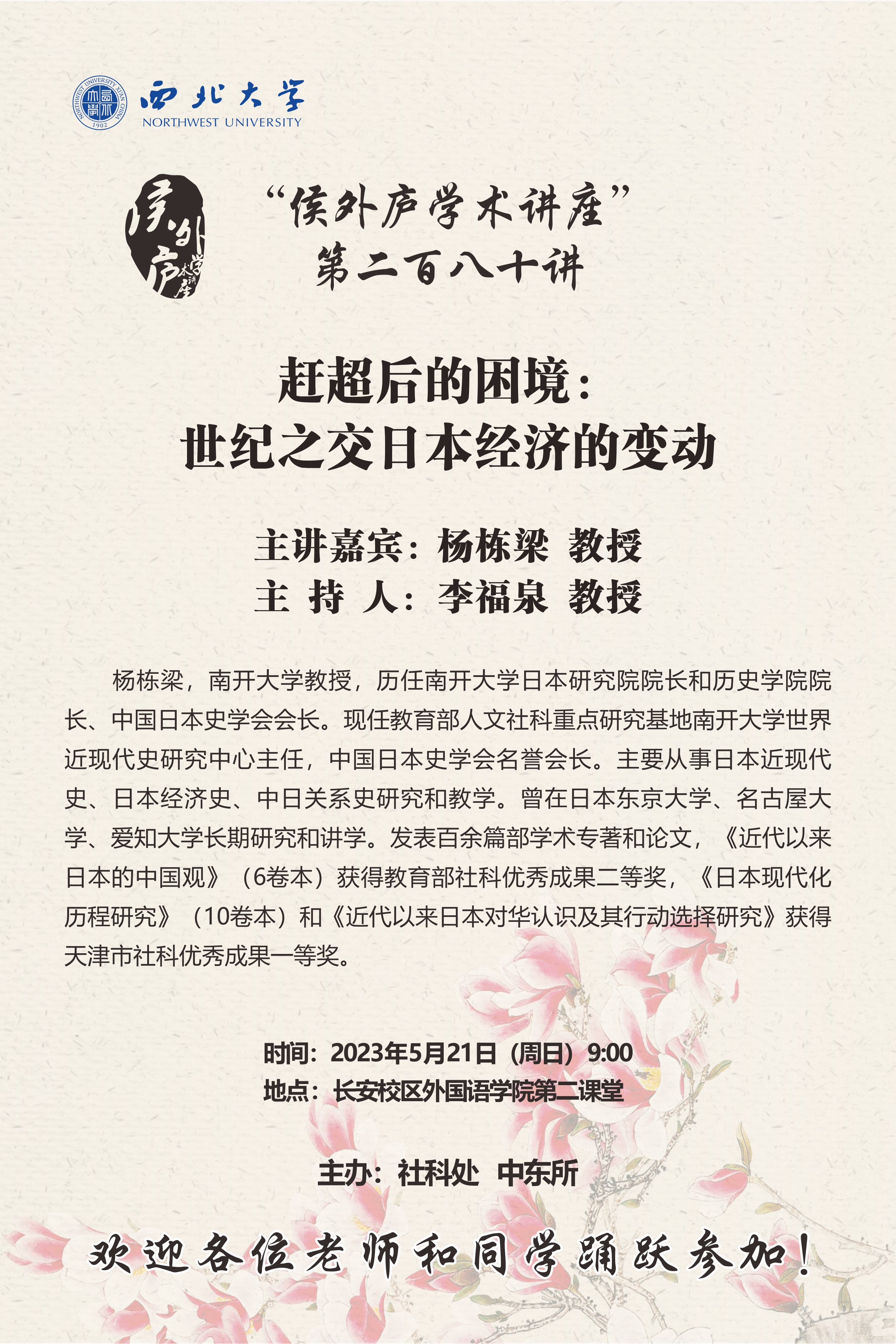 杨栋梁 教授 侯外庐学术讲座第二百八十讲:赶超后的困境:世纪之交日本经济的变动 讲座时间 2023年5月21日(周日)09:00 讲座地点 长安校区外国语学院第二课堂 讲座人介绍 杨栋梁 教授 讲座内容