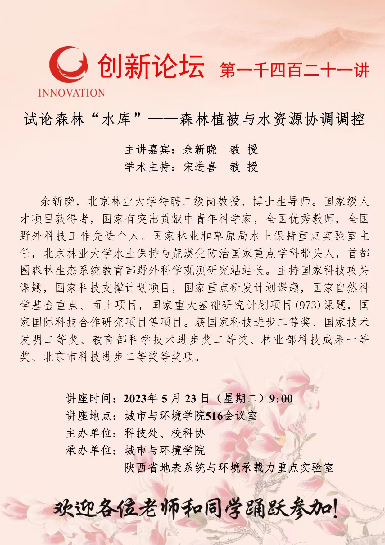 余新晓 教 授 bat365正版唯一官网创新论坛第一千四百二十一讲:试论森林“水库”——森林植被与水资源协调调控 讲座时间 2023年5月23日(星期二)9:00 讲座地点 城市与环境学院516会议室 讲座人介绍 余新晓 教 授 讲座内容