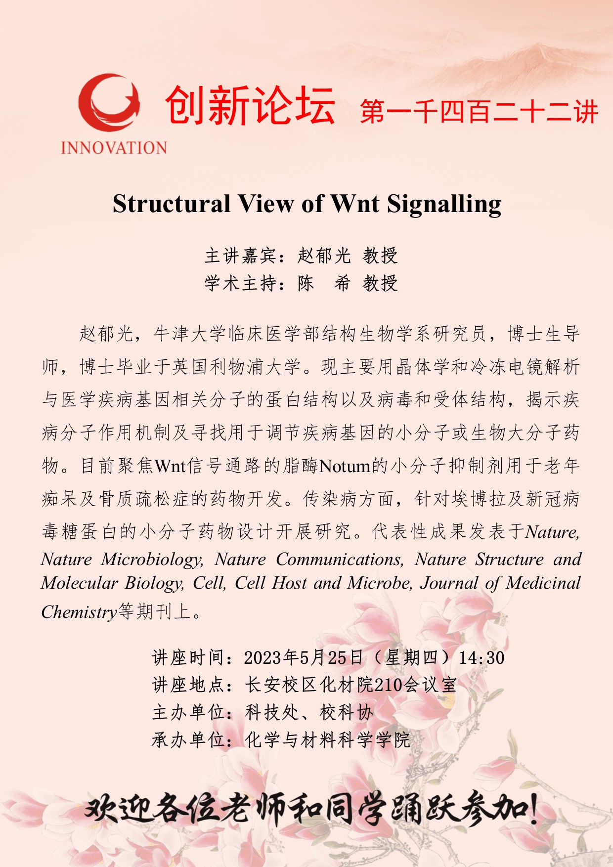 赵郁光 教授 bat365正版唯一官网创新论坛第一千四百二十二讲:Structural View of Wnt Signalling 讲座时间 2023年5月25日(星期四)14:30 讲座地点 长安校区化材院210会议室 讲座人介绍 赵郁光 教授 讲座内容
