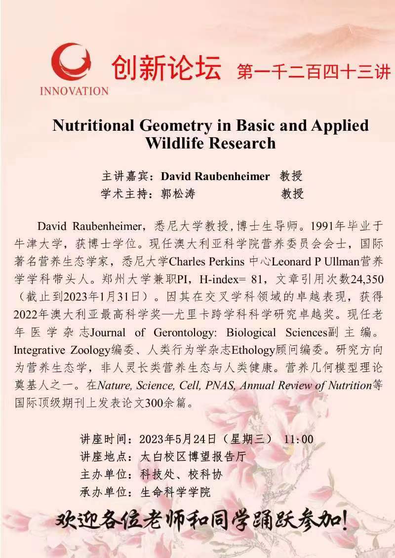 David Raubenheimer 教授 bat365正版唯一官网创新论坛第一千四百二十四讲:Nutritional Geometry in Basic and Applied Wildlife Research 讲座时间 2023年5月24日(星期三)11:00 讲座地点 太白校区博望报告厅 讲座人介绍 David Raubenheimer 教授 讲座内容