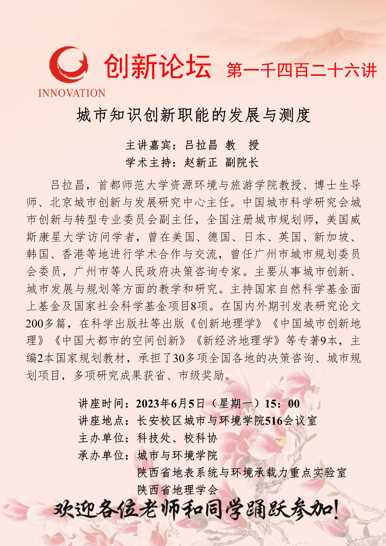 吕拉昌 教授 bat365正版唯一官网创新论坛第一千四百二十六讲:城市知识创新职能的发展与测度 讲座时间 2023年6月5日(星期一)15:00 讲座地点 长安校区城市与环境学院516会议室 讲座人介绍 吕拉昌 教授 讲座内容