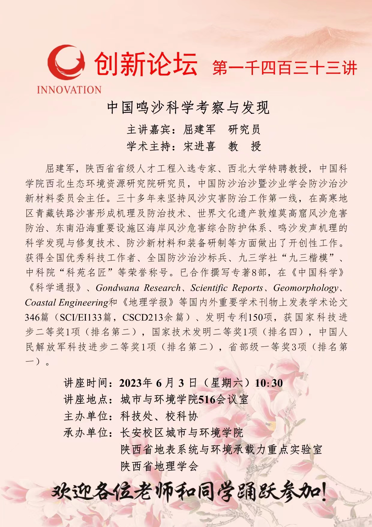 屈建军 研究员 bat365正版唯一官网创新论坛第一千四百三十三讲:中国鸣沙科学考察与发现 讲座时间 2023年6月3日(星期六)10:30 讲座地点 城市与环境学院516会议室 讲座人介绍 屈建军 研究员 讲座内容