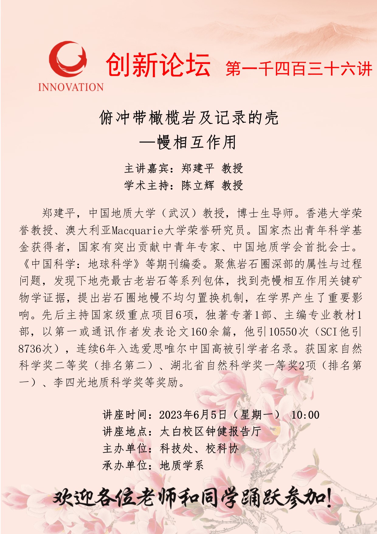 郑建平 教授 bat365正版唯一官网创新论坛第一千四百三十六讲:俯冲带橄榄岩及记录的壳—幔相互作用 讲座时间 2023年6月5日(星期一) 10:00 讲座地点 太白校区钟健报告厅 讲座人介绍 郑建平 教授 讲座内容