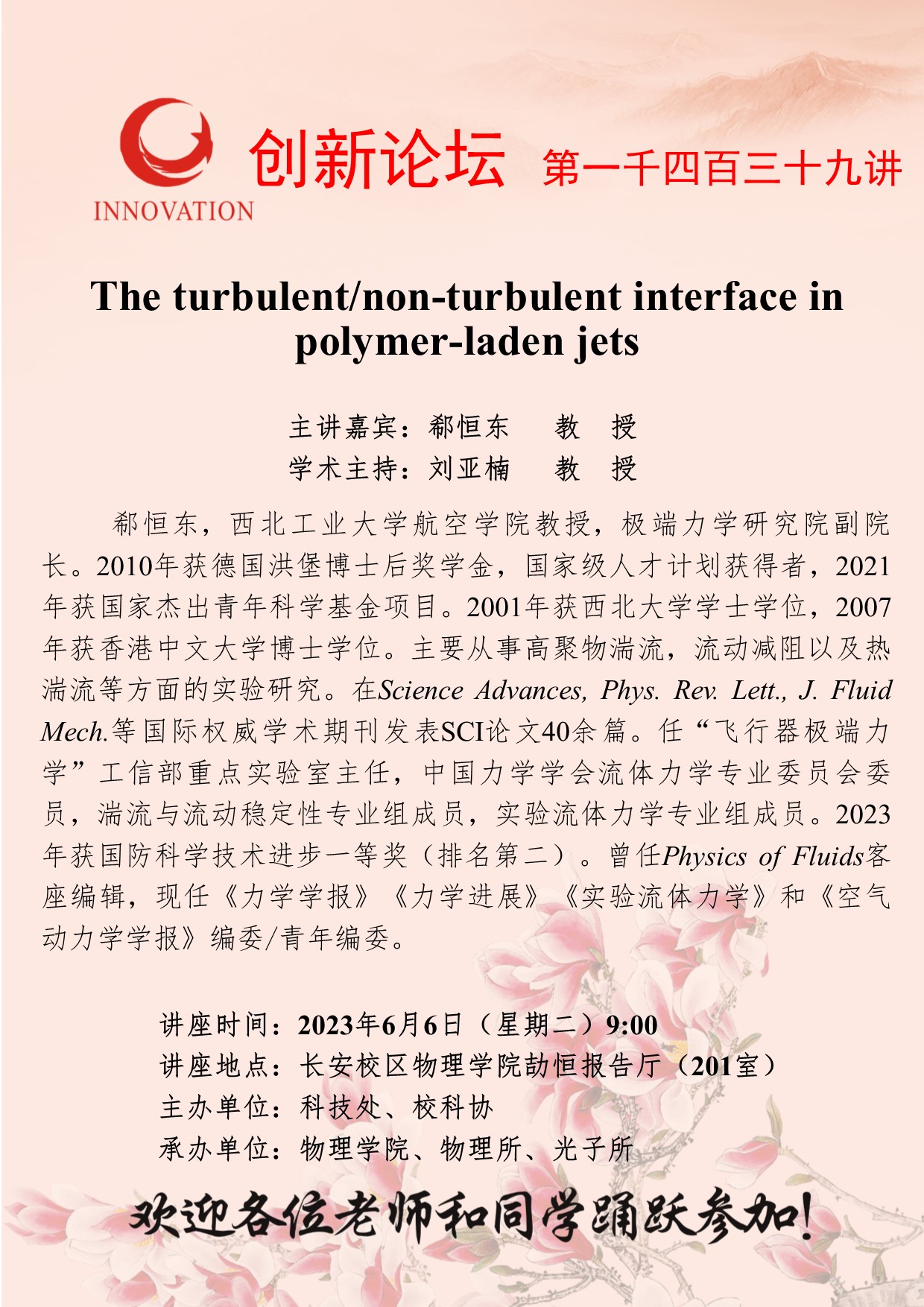 郗恒东 教授 bat365正版唯一官网创新论坛第一千四百三十九讲:The turbulent/non-turbulent interface in polymer-laden jets 讲座时间 2023年6月6日(星期二)9:00 讲座地点 长安校区物理学院劼恒报告厅(201室) 讲座人介绍 郗恒东 教授 讲座内容