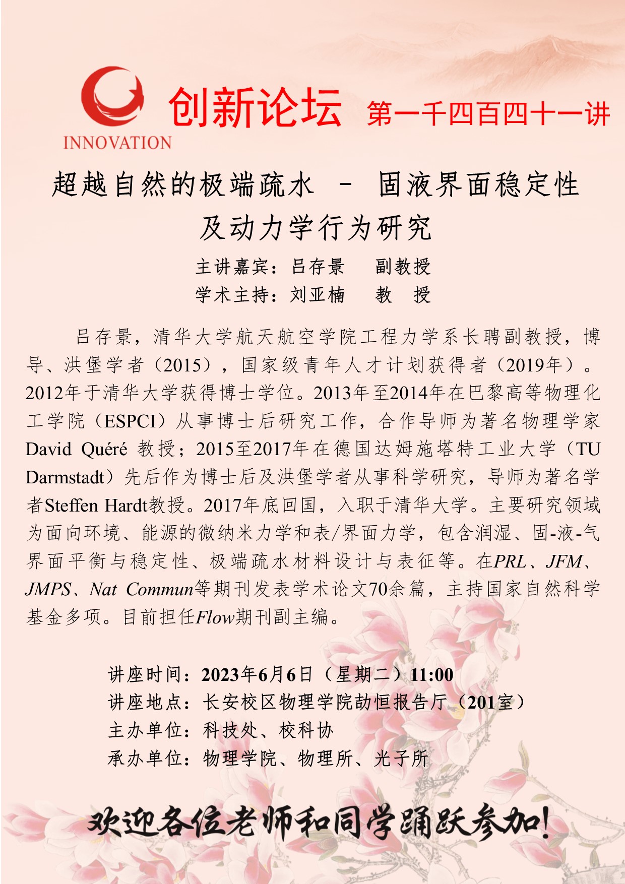 吕存景 副教授 bat365正版唯一官网创新论坛第一千四百四十一讲:超越自然的极端疏水 – 固液界面稳定性及动力学行为研究 讲座时间 2023年6月6日(星期二)11:00 讲座地点 长安校区物理学院劼恒报告厅(201室) 讲座人介绍 吕存景 副教授 讲座内容