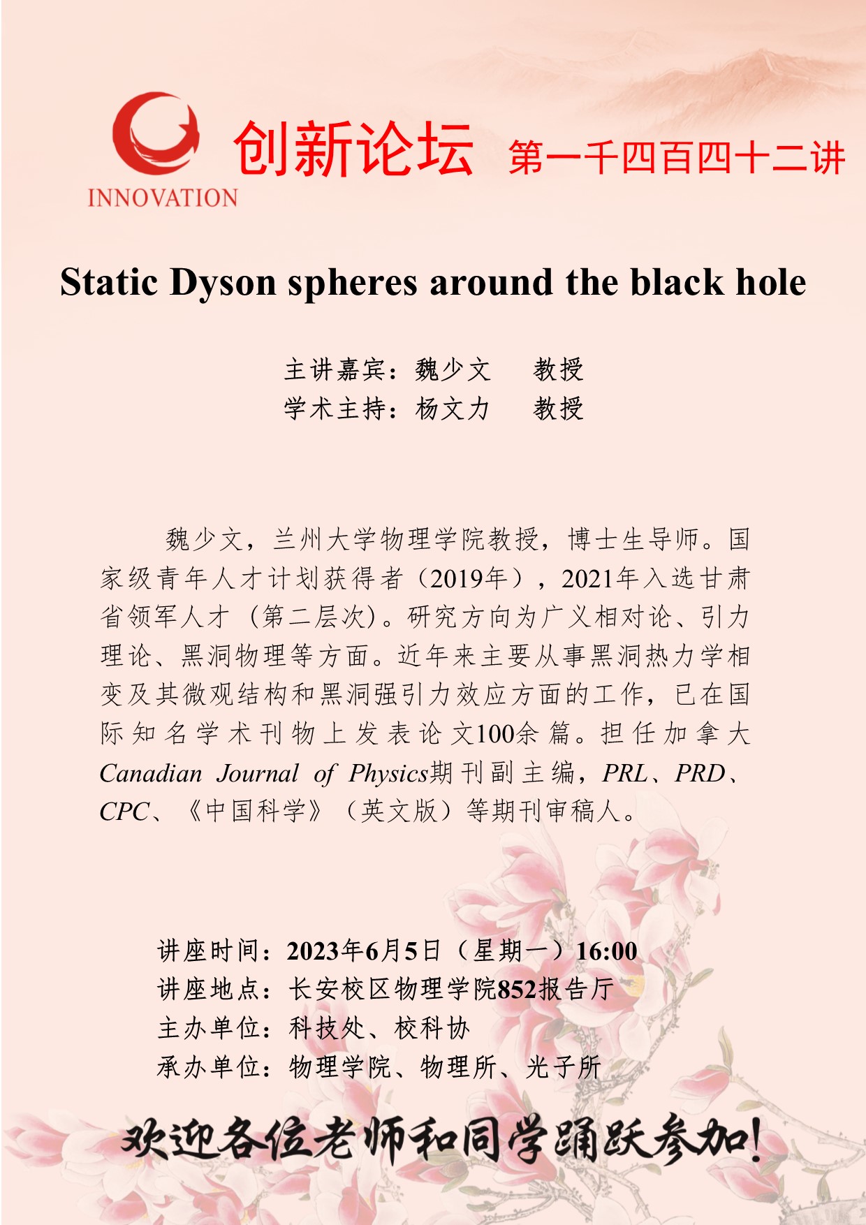 魏少文 教授 bat365正版唯一官网创新论坛第一千四百四十二讲:Static Dyson spheres around the black hole 讲座时间 2023年6月5日(星期一)16:00 讲座地点 长安校区物理学院852报告厅 讲座人介绍 魏少文 教授 讲座内容