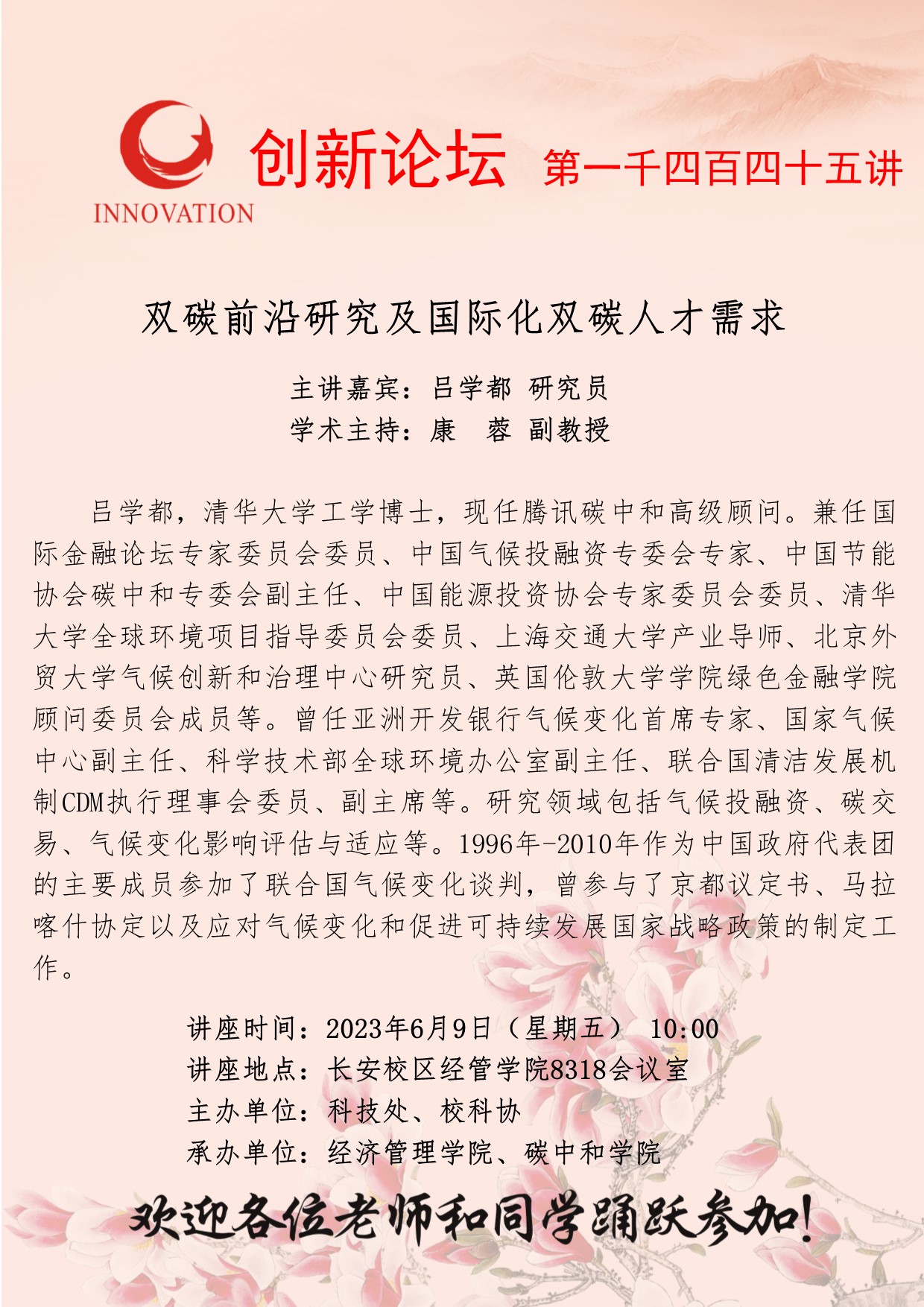 吕学都 研究员 bat365正版唯一官网创新论坛第一千四百四十五讲:双碳前沿研究及国际化双碳人才需求 讲座时间 2023年6月9日(星期五) 10:00 讲座地点 长安校区经管学院8318会议室 讲座人介绍 吕学都 研究员 讲座内容