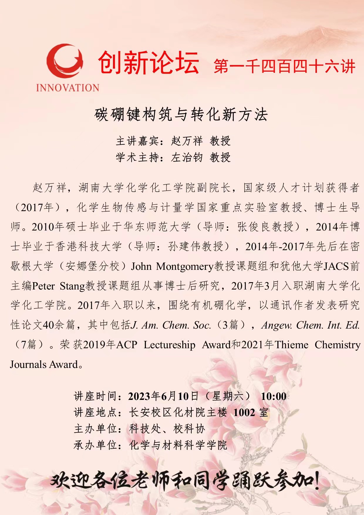 赵万祥 教授 bat365正版唯一官网创新论坛第一千四百四十六讲:碳硼键构筑与转化新方法 讲座时间 2023年6月10日(星期六) 10:00 讲座地点 长安校区化材院主楼 1002 室 讲座人介绍 赵万祥 教授 讲座内容