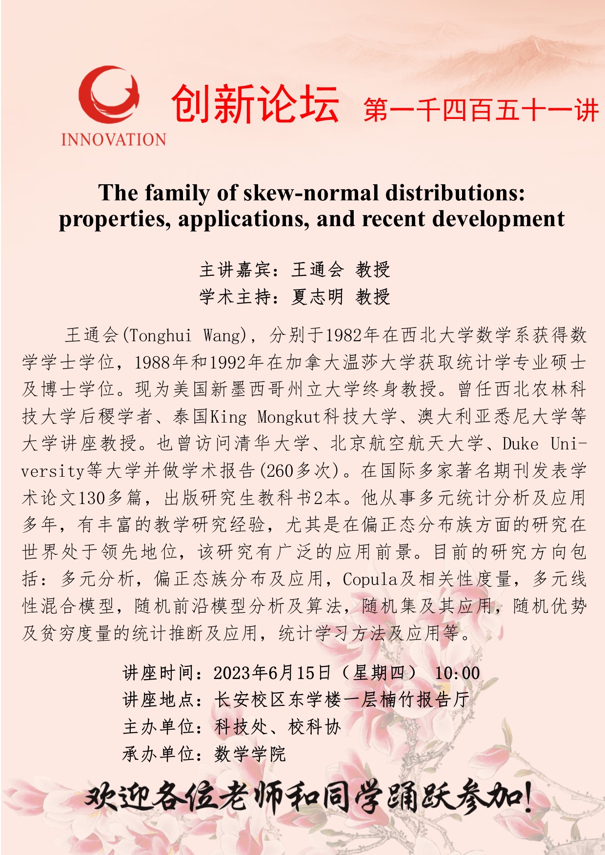 王通会 教授 bat365正版唯一官网创新论坛第一千四百五十一讲:The family of skew-normal distributions: properties, applications, and recent development 讲座时间 2023年6月15日(星期四) 10:00 讲座地点 长安校区东学楼一层楠竹报告厅 讲座人介绍 王通会 教授 讲座内容