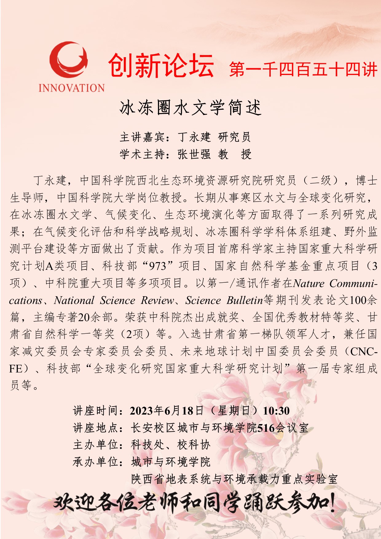 丁永建 研究员 bat365正版唯一官网创新论坛第一千四百五十四讲:冰冻圈水文学简述 讲座时间 2023年6月18日(星期日)10:30 讲座地点 长安校区城市与环境学院516会议室 讲座人介绍 丁永建 研究员 讲座内容