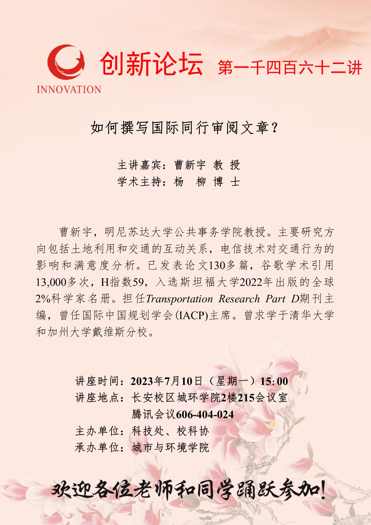 曹新宇 教授 bat365正版唯一官网创新论坛第一千四百六十二讲:如何撰写国际同行审阅文章? 讲座时间 2023年7月10日(星期一)15:00 讲座地点 长安校区城环学院2楼215会议室 讲座人介绍 曹新宇 教授 讲座内容