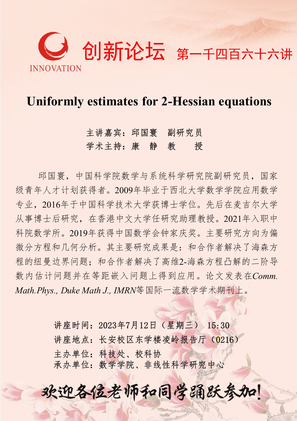 邱国寰 副研究员 bat365正版唯一官网创新论坛第一千四百六十六讲:Uniformly estimates for 2-Hessian equations 讲座时间 2023年7月12日(星期三) 15:30 讲座地点 长安校区东学楼凌岭报告厅(0216) 讲座人介绍 邱国寰 副研究员 讲座内容